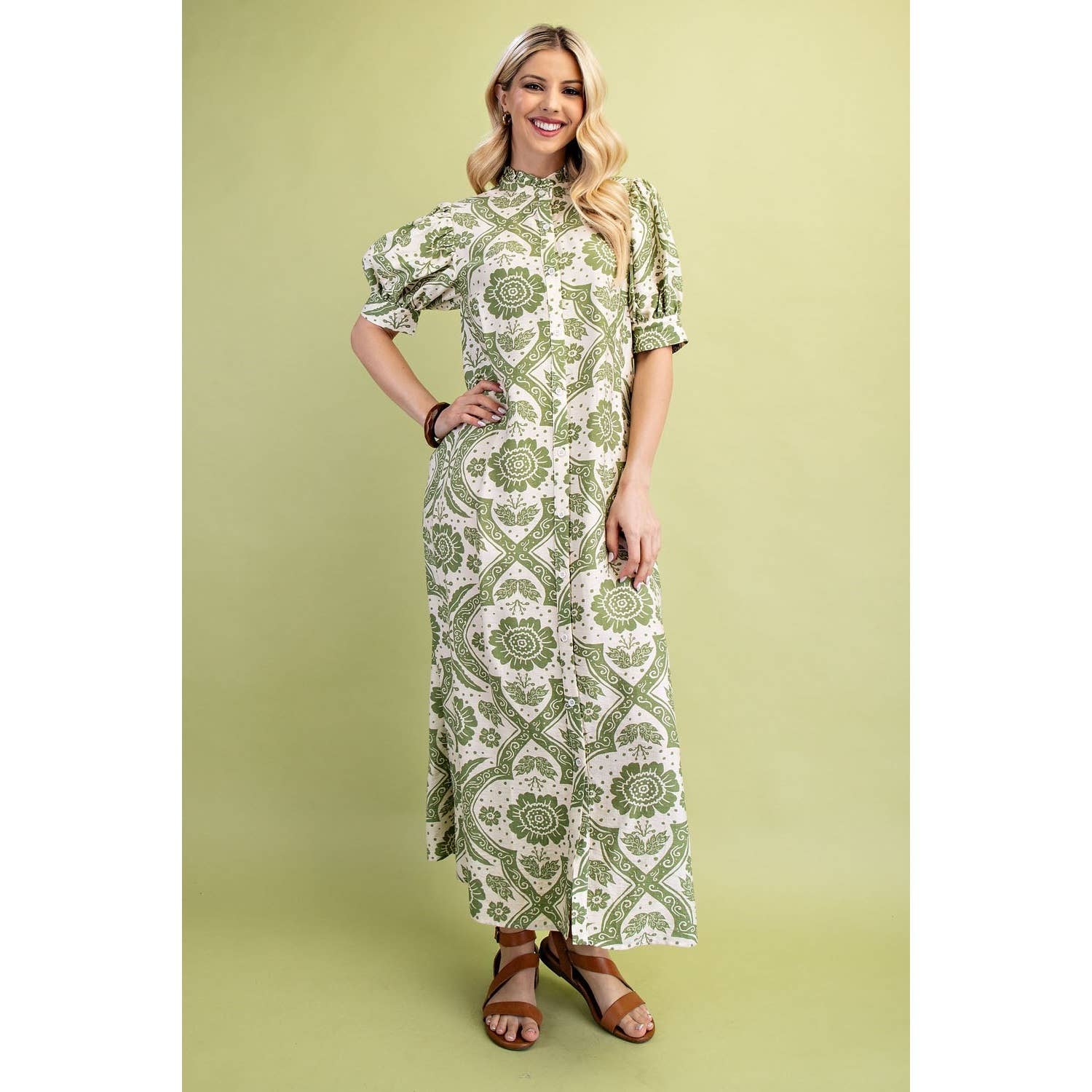 - PUFF SLEEVE PRINTED WOVEN TIERED MINI DRESS WITH RIB BAND COLLAR AND POCKETS - MODEL IS 5'7 AND WEARING SIZE SMALL - S:100%COTTON - C:100%COTTON - L:100%POLYESTER