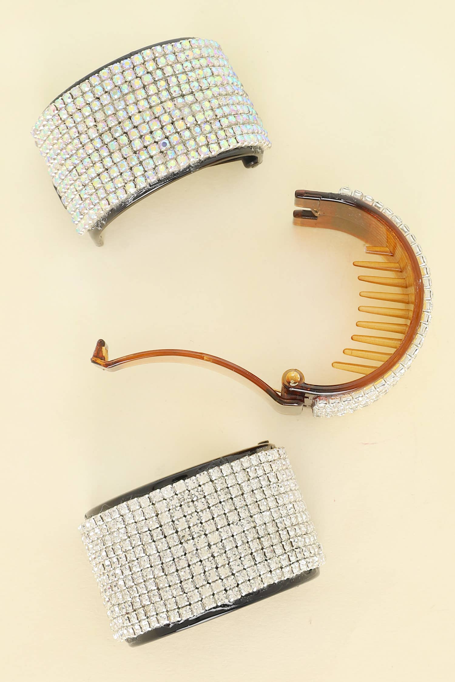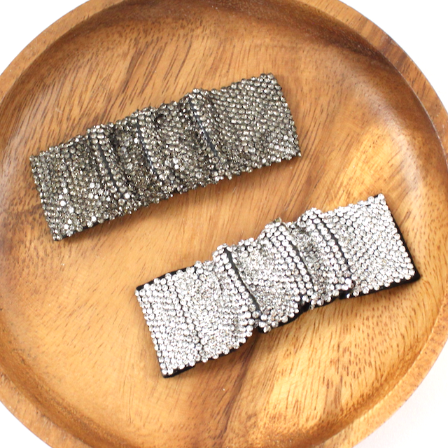 Curved Crystal Ponytail Holder This lustrous crystal ponytail holder features 1.5" (length) x 0.6" (width) of clear crystal rhinestones in a curved design attached to a sturdy, black elastic band.