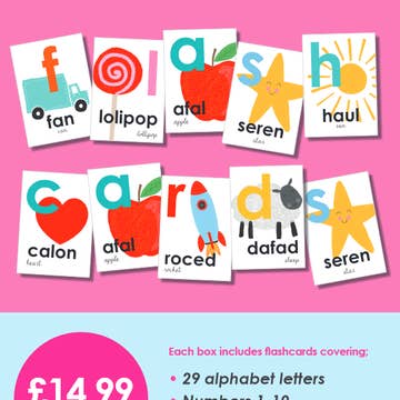Welsh Learning Flashcards, Alphabet/Numbers/Colours/Shapes Mae Cardiau Fflach yr Wyddor Gymraeg yn gardiau dwyochrog (trowch drosodd i weld) Ein cardiau ffl Encourage your child’s Welsh language skills with these 29 Alphabet Flash Cards. Perfect for children learning their first words, these educational cards are designed to assist with reading and writing development. The cards feature the colourful theme of the alphabet to the front and extra learning activities to the reverse, with numbers 1-10, 10 colours and 9 shapes. These ‘alphabet flash cards’ help with letter recognition, pronunciation, and word association. The cards are made from high-quality materials to ensure durability and longevity. Make learning fun and interactive with these engaging ‘alphabet flash cards’, perfect for parents and educators alike. Each box includes flashcards covering; • 29 alphabet letters • Numbers 1-10 • 10 Colours • 9 Shapes • Wipeable • Gloss Laminated double sided 58 designs (Turn and See)
