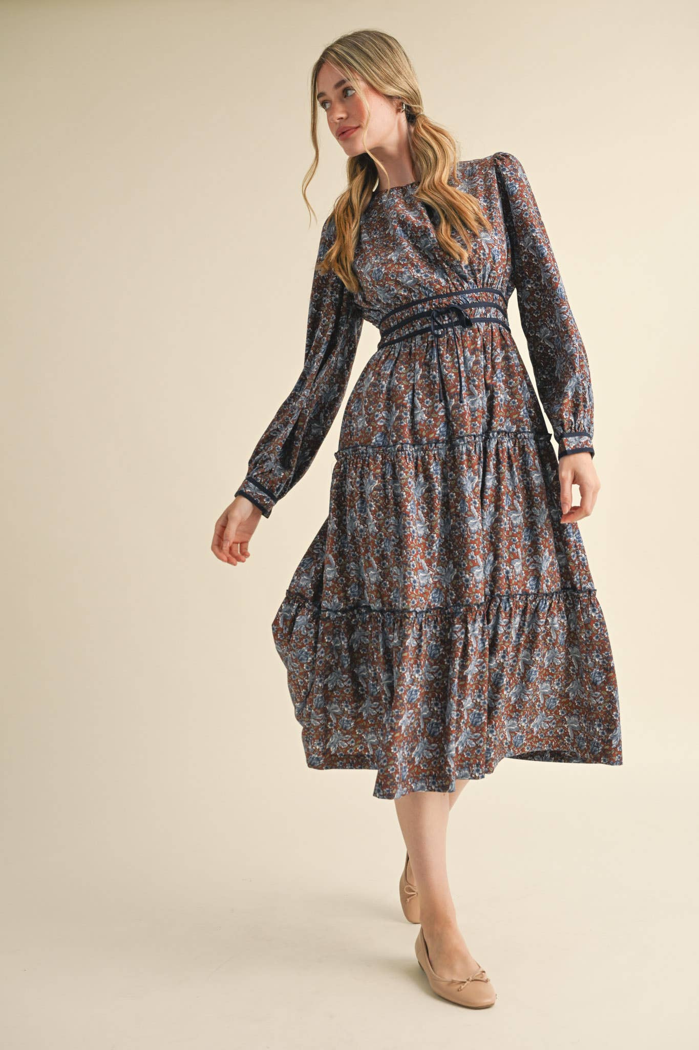 SKU: EE1166-TAUPE-S, EE1166-TAUPE-M, EE1166-TAUPE-L Made in China Aesthetic: Bohemian and Casual Dress Style: Fit & Flare Embellishment: Pockets Fabric: 100% Rayon Challis Fit: Contemporary and Maternity Neckline: Square neck Occasion Theme: Everyday and Father's Day Occasion: Everyday Pattern: Floral Season: Fall/Winter Skirt & Dress Length: Midi Sleeve Length: Long Sleeve Weight: 290.3 g (10.24 oz)