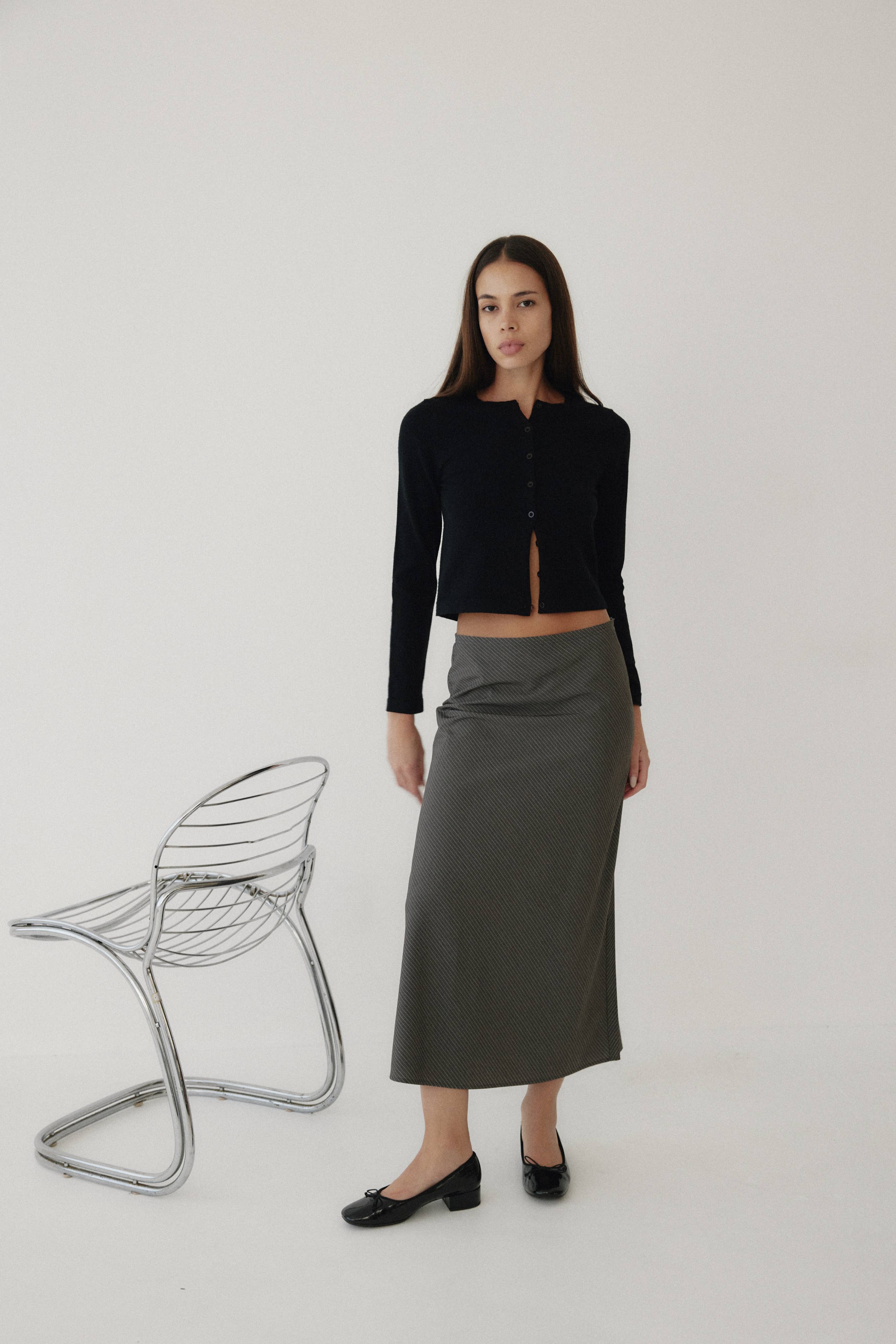 The Ginny Capri Pants are pinstripe knee-length capris complete with a low-rise, front welt pockets, and unique side slits.