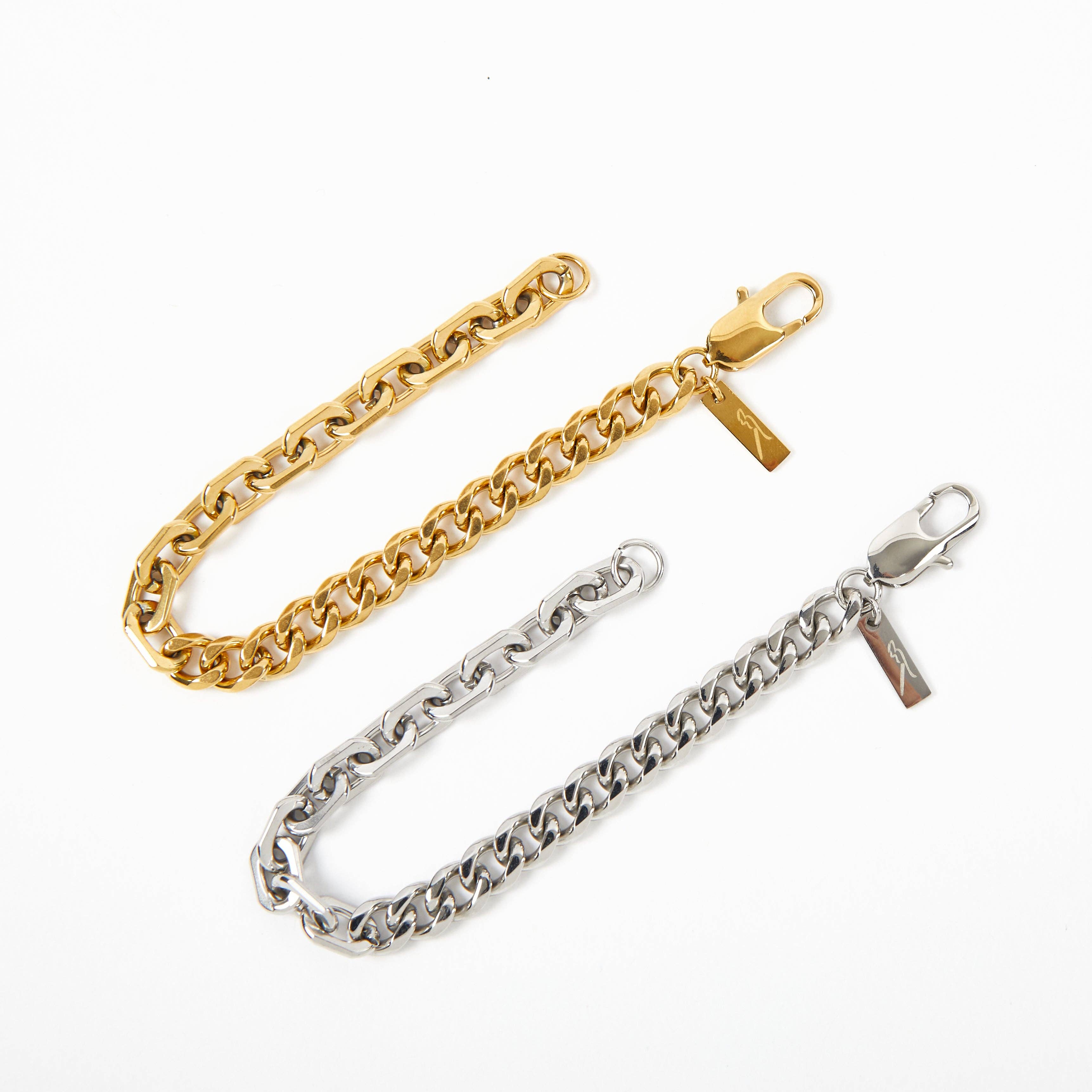 Bringing you the nostalgia of charm bracelets, with a 420 twist. This bracelet features our Mixy Bracelet + 1 of each charm (B0ng, Dab, Nug, Roach, Lighter). Charms are removable from chain bracelet - giving the versatility to style how you want! Clip charms to purse hardware, keychains, or even you existing necklace chains. PRODUCT DETAILS: Stainless steel base 18 Gold plated, Rhodium plated Total length: 7.25 inches (custom length available - please leave a note in your order and we will confirm via Faire msg) Nickel and Lead-free Non-Tarnishing, Hypoallergenic base metal, Waterproof Retail Packaging Included: Box + Pouch