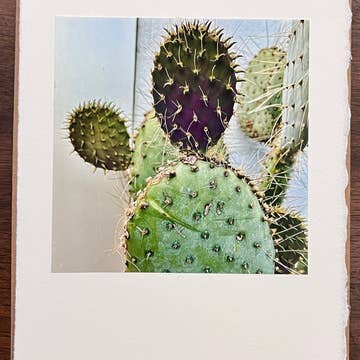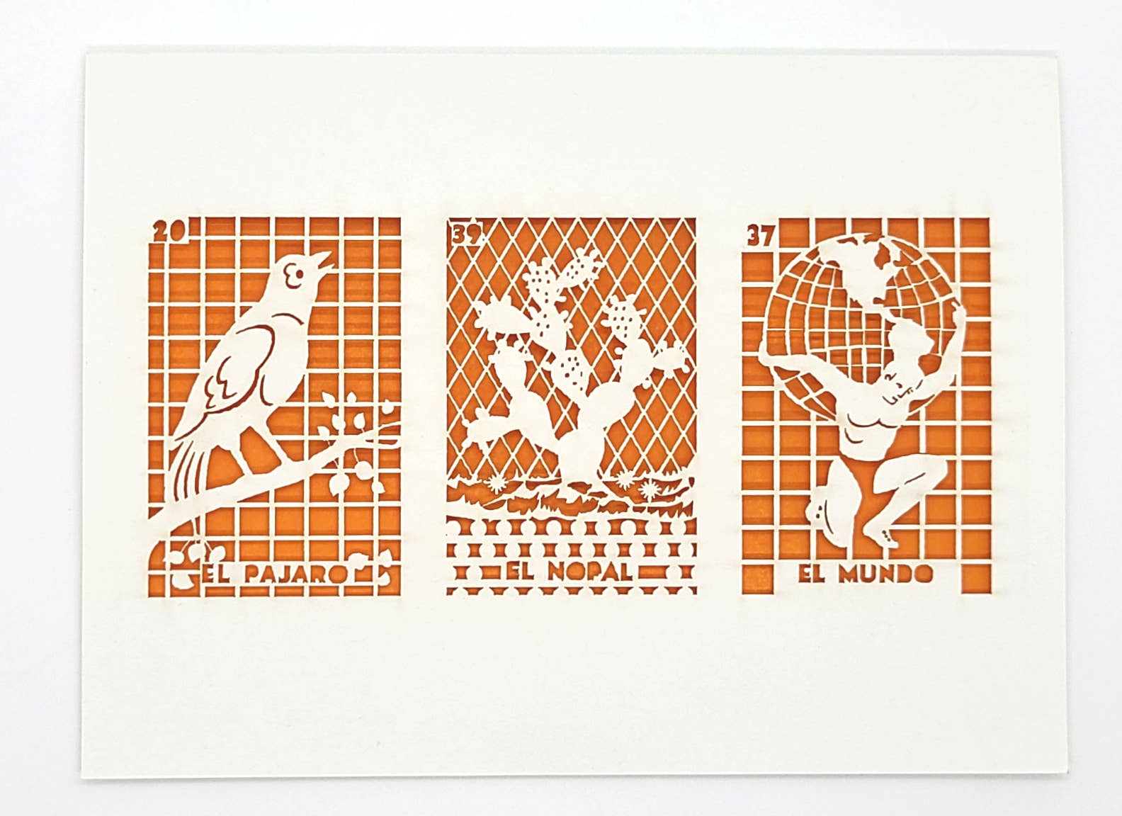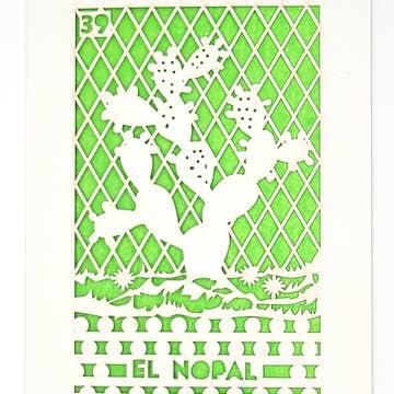 El Nopal - Cactus in Spanish. This is one of the Loteria cards - which is a Mexican Bingo like game. Laser cut card with colored tissue paper backing. Blank on the inside Individual cards come in a protective compostable PLA sleeve card size - A7 5" x 7" A2 4.25'' x 5.5''