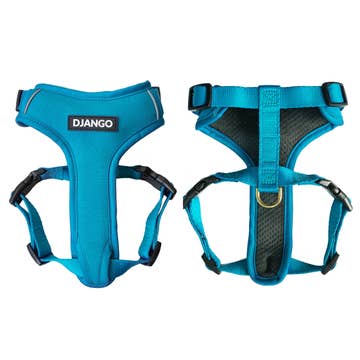 DJANGO’s Adventure Dog Harness is a comfortable, durable, and stylish dog harness designed for outdoor adventures and everyday wear. The weather-resistant and padded neoprene exterior is complimented by breathable sport mesh lining, and heavy-duty webbing. Beautiful solid cast brass hardware adds sophistication and strength to the adventure design. The padded and lightweight body maximizes comfort, while a narrow and deep body prevents any risk of chafing. KEY FEATURES - Weather-resistant and padded neoprene exterior - Soft and breathable sport mesh lining - High-strength and corrosion-resistant solid brass hardware - Supple and colorfast webbing - Four points of adjustment (neck and chest) - Dual side-release buckles for easy on and off - Reflective piping - Classic DJANGO logo MATERIALS - Neoprene exterior and polyester sport mesh interior - Polyester webbing - Solid cast brass hardware SIZING - SMALL: 13-16.5" chest girth - MEDIUM: 17-20.5" chest girth - LARGE: 21-26" chest girth