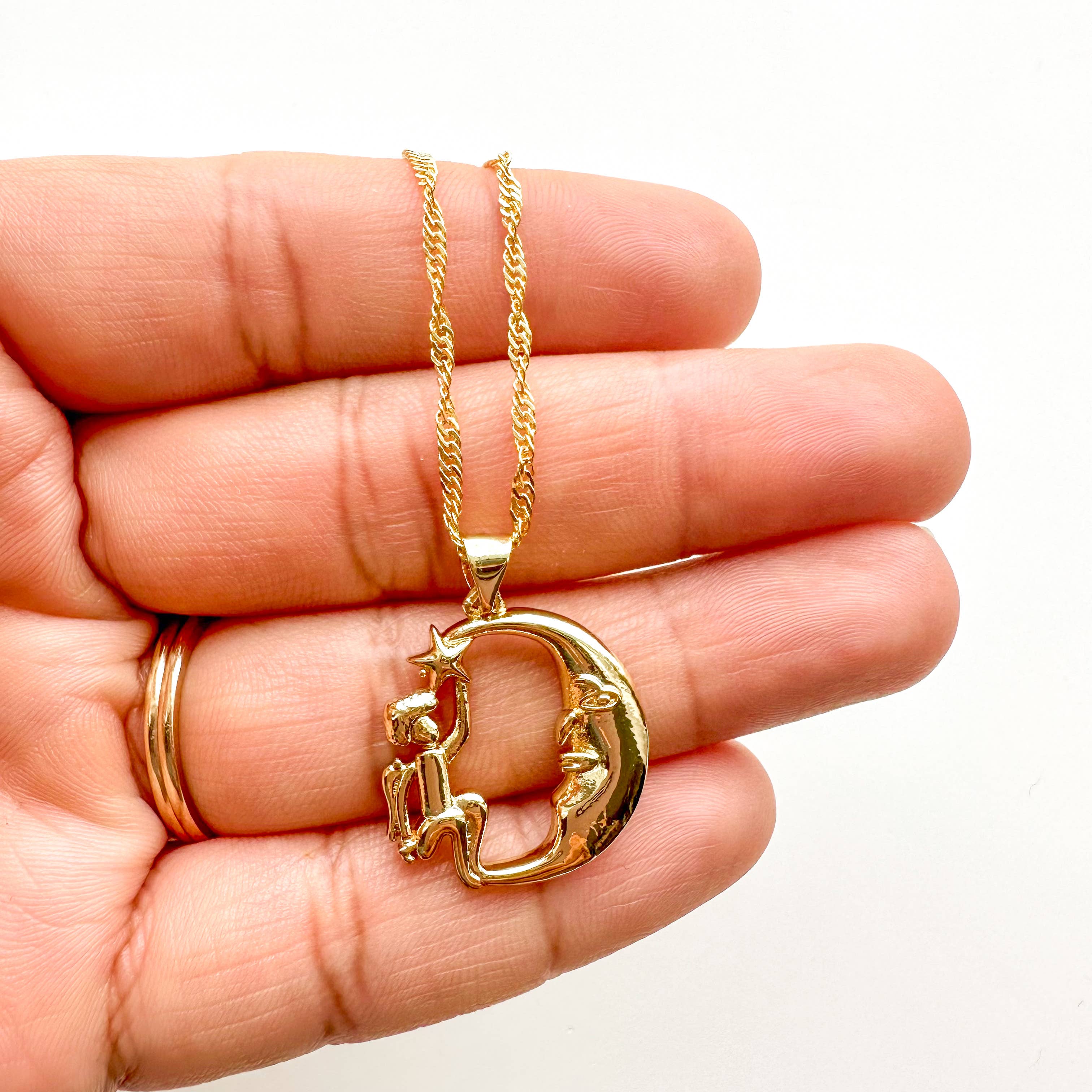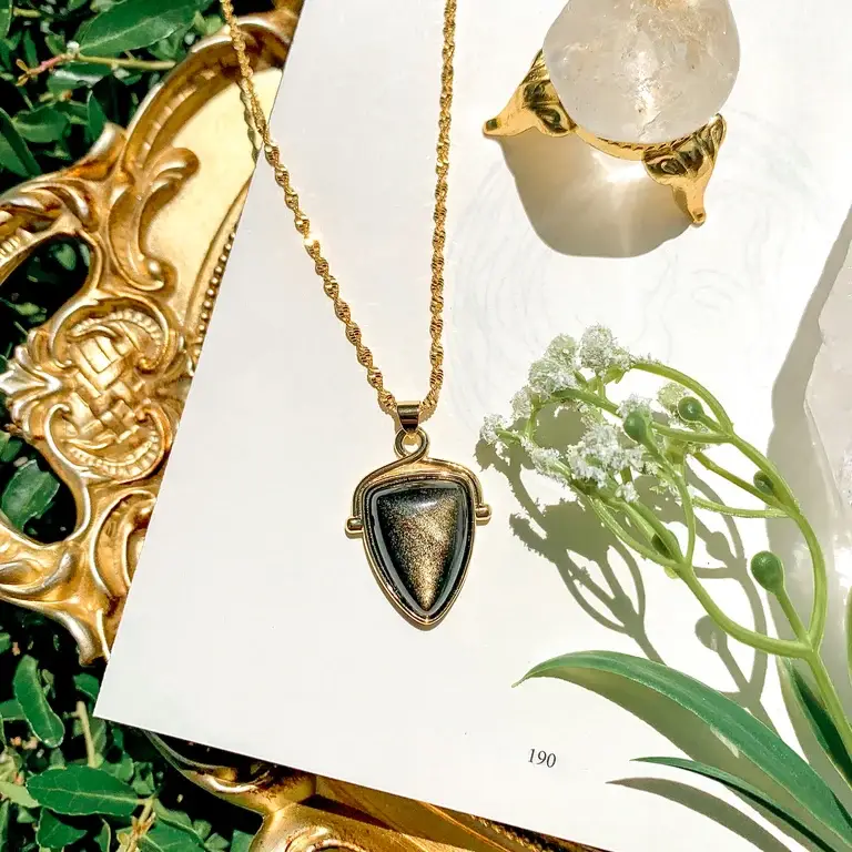 A 17” gold plated/silver plated long figaro chain with a 2” chain extender, decorated with 7 gold plated/silver plated charms. Charms left to right: a cubic zirconia star, a round black bezel charm, a black cubic zirconia triangle charm, an onyx gemstone charm, a sword charm, a round black bezel charm, and a cubic zirconia star. This jewelry design is created independently and is not affiliated with or endorsed by Sarah J Maas or Bloomsbury Publishing.