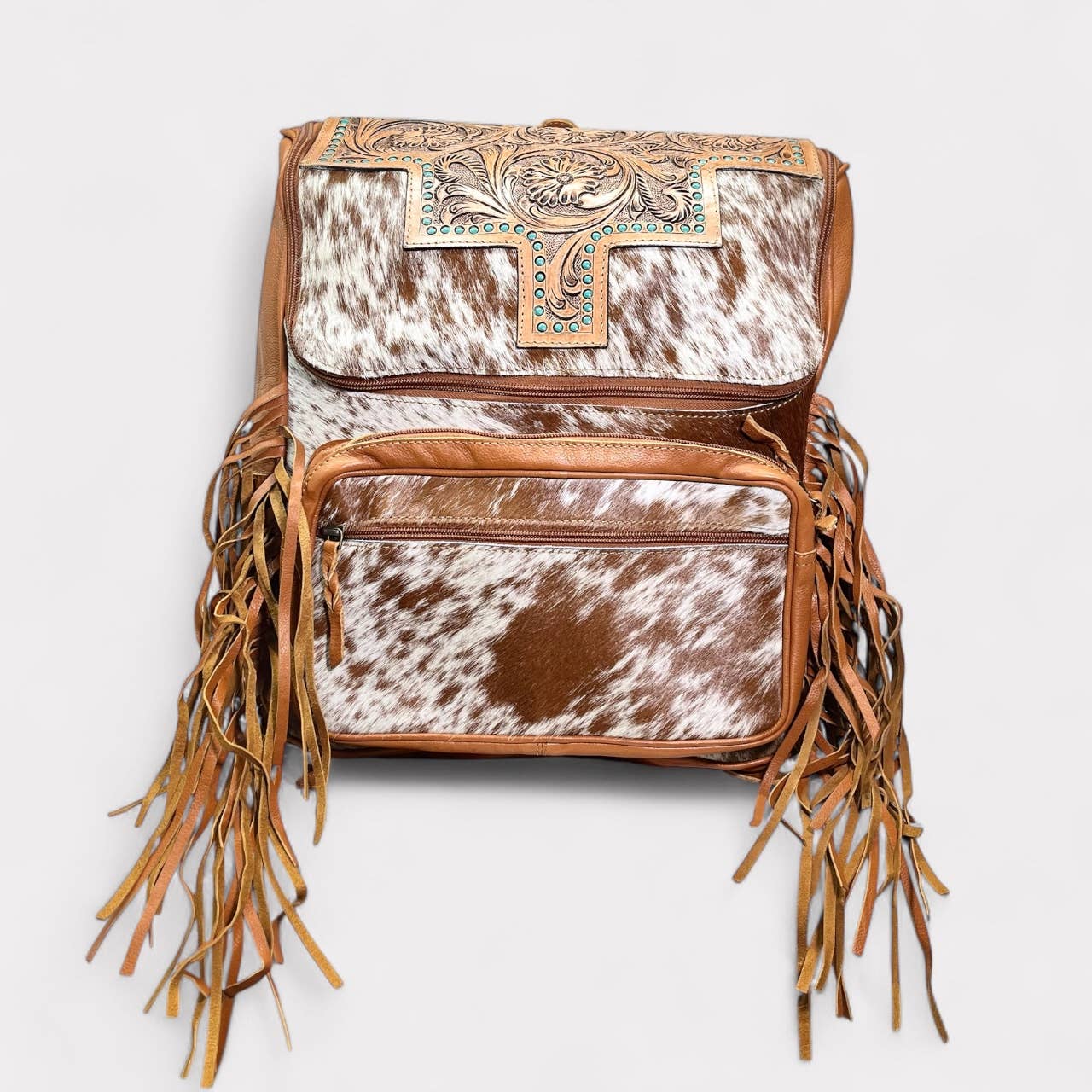 Espresso brown deer skin marty hip bag designer purse. Turquoise washed Venetian print, oak leaf print and gator leather lid. Fringe is 7" at longest point from bottom of hip bag. Average dimensions on marty bag averages 7"x 1.5" x 5" for bag compartment. Adjustable shoulder or belt strap included. Magnetic closure lid. Zipped top. Interior credit card or easy access pocket. Hands free purse.