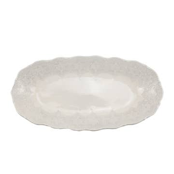 This glass plate features a silver scalloped rim, adding a touch of elegance and refinement to your table setting. Crafted from durable glass, it is ideal for both everyday use and special occasions. Measures: Medium- 14.25"L x 6.5"W x 1.25"H Large - 18"L x 7"W x 1.25"H