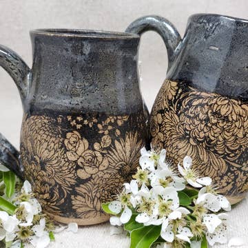 Handmade/wheel-thrown ceramic mug with a varying black print flower pattern in a black glaze with a greyish blue hue overlay Dimensions: 4.5"H x 3"diameter, holds approx. 16 oz. Dishwasher & microwave safe.