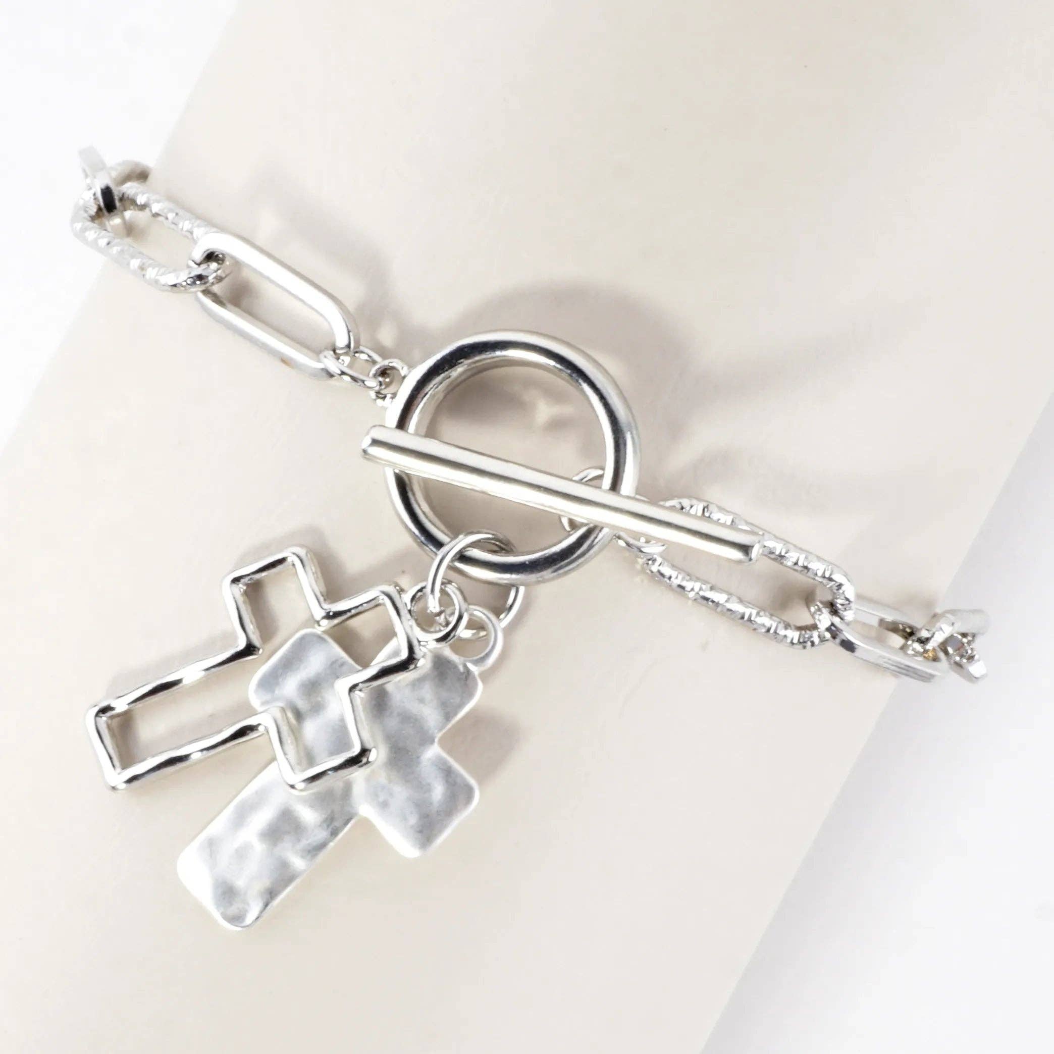 Stainless Steel Double Chain style bracelet with cross at the clasp (please see image for exact placement) The chain style bracelet twists at the beginning giving it a very classic, rugged look! Currently available in silver & is in stainless steel material!