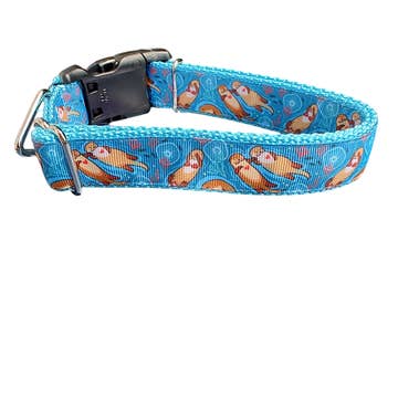 Introducing our nautically inspired seagull dog collar! This collar features a charming teal background adorned with playful seagulls and French fries, adding a touch of seaside fun to your furry friend's wardrobe. Crafted with durability in mind, it comes equipped with a sturdy black plastic buckle, making it both cute and heavy-duty for any adventure your pup embarks upon. Let your canine companion sail through the day in style. This print is now 3/4” XS and Small, 1” medium and large as of 6/10/24. Previously all 1”. Our hand sewn collars are made with vibrant custom woven ribbon, sewn on heavy duty nylon webbing. All collars are adjustable with a nickel plated metal slide. All collars are finished with a nickel plated heavy duty welded D ring, sewn in beside a heavy plastic YKK brand buckle. •suitable for large strong dogs •unique prints you won’t find elsewhere •made in the USA • metal hardware and heavy duty plastic clasp •5⭐️ rated on Etsy with over 3000 reviews!