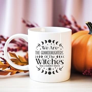 Halloween Collection. These mugs feature Halloween sayings and imagery. The design repeats on each side of the mug. This saying is featured in the movie Hocus Pocus. Dishwasher and microwave safe.