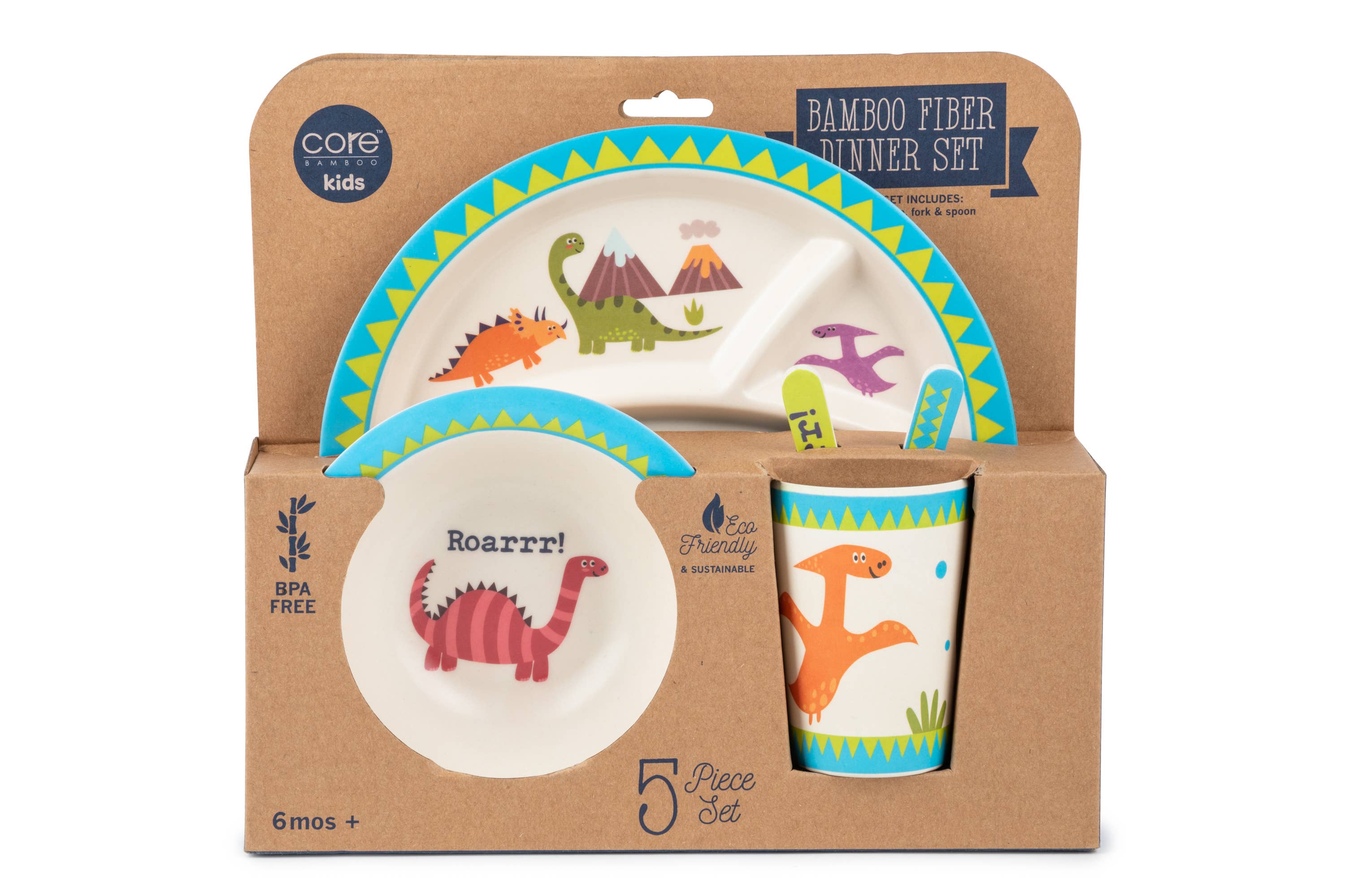 Introducing our new Funkins bamboo dish sets for little ones! Thoughtfully designed to create joyful mealtimes while caring for our earth, these adorable bamboo dishes are an eco-friendly mealtime solution that is both safe and fun. Why you will love these Bamboo dishes: • Bright and cheerful • High quality natural, bamboo • Sized perfectly for kids • Get the set! Add the matching Funkins reusable soft cloth napkins and placemats to help make mealtime cleaner and greener. • Award-winning, trusted family-owned brand Details & Care • Set includes 5 pieces: divided plate, bowl, cup, fork and spoon • Molded of bamboo fiber, cornstarch and melamine • Dishwasher safe, upper rack only • For best care, hand wash • Not for use in microwave • Phthalate, BPA, Lead and Toxin Free • Imported