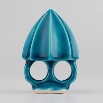 Wearable citrus squeezer for the loved ones, in the kitchen. Ring Juicer features a conventional juicer head paired with double finger holes, providing an ergonomic grip while you are squeezing lemons, limes and oranges. It is a straight fashion statement when you display it in your kitchen. Handmade ceramic in limited edition. Dishwasher safe.