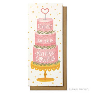 This money card is perfect for a giving a wedding gift of cash or check. FRONT: Congrats to the happy couple INSIDE: blank DETAILS: • Dimensions - one 9.25" x 3.875" folded card • Paper - 100% recycled, 100# natural cardstock • Envelope - kraft recycled envelope (#10) • Packaging - sealed in a clear sleeve