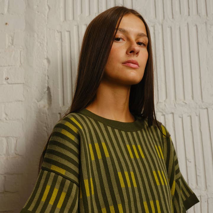 Our signature Bauhaus Tee—crafted from deadstock Pima cotton and designed with a bold jacquard knit. Lightweight, breathable, and easy to style, it’s a wardrobe essential. * Slightly cropped and boxy body * 100% Cotton * Artisan made in Peru with Fair Trade practices to maintain ethical and responsible integrity * Designed for a relaxed, oversized fit. Stick with your usual size for the intended look, size up for an even roomier fit, or size down for a tighter fit.