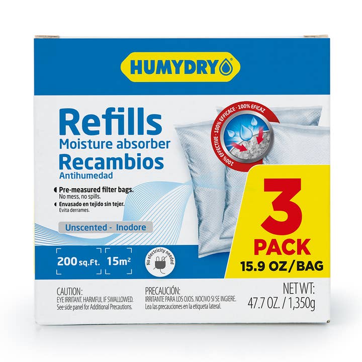 HUMYDRY® Premium 15.9 oz. is an innovatively designed non-electric dehumidifier. It features a patented anti-spill system and engineered tray design that does not allow liquid to overflow or spill when tipped. Contains safety clips and is easy to empty. It helps eliminate humidity and condensation from your environment and improves air quality. Excessive moisture can cause musty odors, mold, mildew, must and stains. Use in closets, kitchens, offices, bathrooms, bedrooms, laundry rooms, second homes and RV's. *Includes one 15.9 oz device and one refill *Use in spaces up to 200 sq. ft. *Lasts up to 90 days depending on humidity levels *Refillable and reusable - pre-measured refills available *Dishwasher safe (top rack only) *Made in Spain
