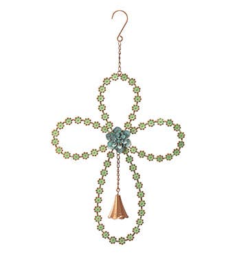 Celtic cross wind chime in silver enamel finish. Hangs from green ribbon. 3” W x 9” H excluding ribbon. Window boxed with “May the road rise” poem.