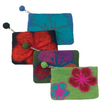 Our beautiful collection of handmade wallets, purses, pouches, cosmetic bags, and coin purses are crafted by talented artisans from Nepal. Each item is created using ethical and sustainable practices, such as up-cycling, recycling, felted wool, embroidery, ensuring the highest quality of craftsmanship. -Felted Wool - zipper closure - Size approx. 6" x 4" - 6 in a pack