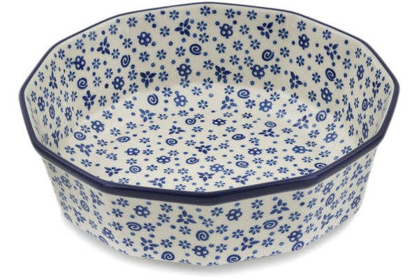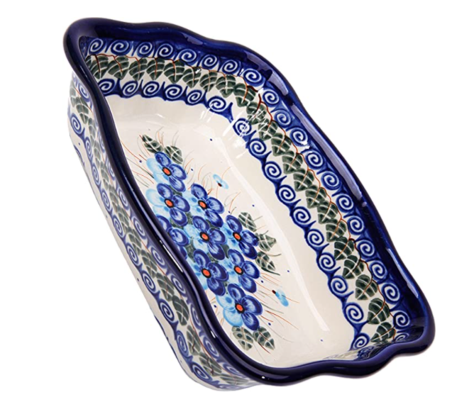 This Forget Me Not 10" Rectangular Baker was handmade and hand decorated in Boleslawiec, Poland by skilled artisans according to old traditional methods. This is a Polish pottery Signature Unikat, which means that it has been hand painted with both sponges and brushes and it is signed by the artist who painted it. Unikat pieces are the most intricate works of art. Larger Unikat items take hours of very careful work to finish.This Polish stoneware is microwave, dishwasher, freezer, and oven safe up to 480°F. It does not contain lead or cadmium. It is part of the Forget Me Not Collection. Dimensions * Height: 2½" * Length: 9¾" * Width: 7¼" * Capacity: 35 oz.