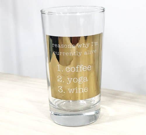 14oz. Old fashioned tumblers. Dishwasher safe. Printed with 22k gold ink. Libbey glassware. *Must place a minimum order of 12 assorted styles.