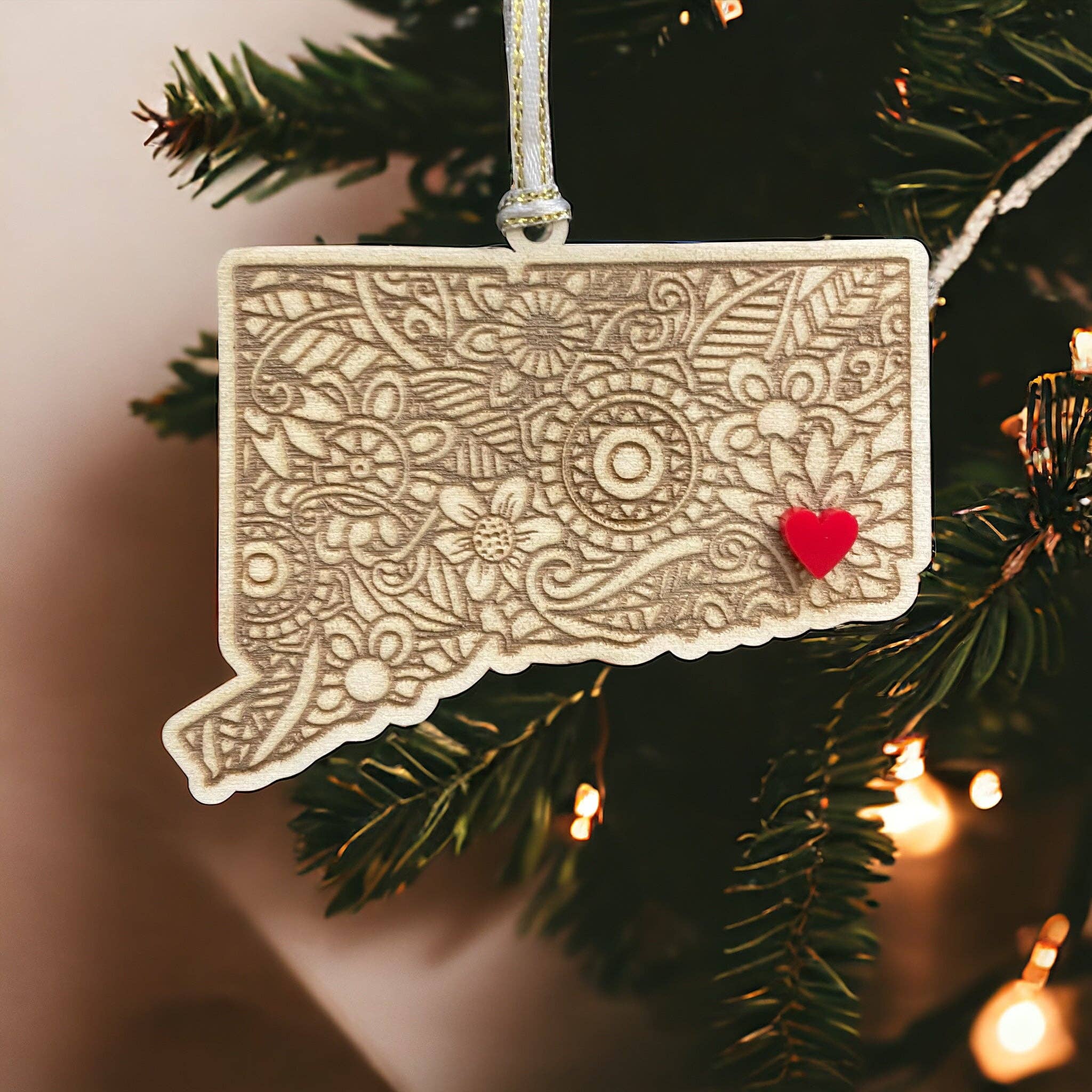 Celebrate your love for Rhode Island and decorate your Christmas tree with our wooden Rhode Island ornament. Featuring a beautiful mandala pattern and acrylic heart to highlight the city of your choosing, our state pride ornaments make unique Rhode Island gifts and vacation travel souvenirs for your family and friends. Gift these unique state ornaments as a stocking stuffer or use as a Christmas gift exchange. Use as holiday party favors for your next company party. Decorate a gift-wrapped package or gift bag or hang on a bottle of wine for a unique hostess gift idea that celebrates your home state. Getting married in Rhode Island? Our charming ornaments make the perfect Rhode Island wedding destination favors and can be engraved with a special message on the back. Perfect for RI state college students, military members, travel lovers or anyone who calls the state of Rhode Island home, our Christmas ornaments make meaningful gifts for those who have a special connection to this The Ocean State. Each ornament includes an optional red or pearl white heart that will be placed in the approximate location of the city of your choosing. Ornaments will include a white and gold ribbon and can be gifted in our optional canvas gift bag. Product Details ✼ Material: Laser cut certified sustainable American wood ✼ Size: 3.5" at it's longest side. Thickness: 3mm ✼ White ribbon with gold accent included ✼ Optional red or white pearl heart adhered ✼ Canvas gift bag optional