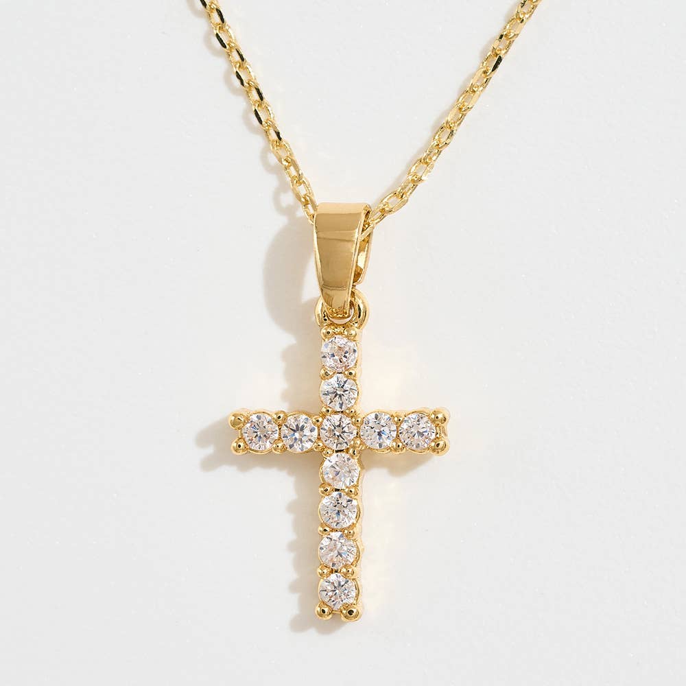 Upgrade your necklace game, this necklace brings a one-of-a-kind gold dipped cubic zirconia pave bubble cross pendant design. A must-have necklace that adds a unique flair to any look. Available in G and S. This item is sold in packs of 1. This necklace approximately measures: Length: 16 Inches Extension: 3 Inches This necklace is made with Gold Dipped Cubic Zirconia Brass.