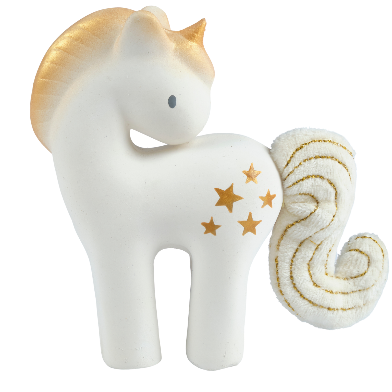 Shining Stars Unicorn rattle baby toy from our Tikiri Fairytales collection. The unicorn rattle combines the developmental benefit and stimulation of sound baby toys. By moving the rattle toy which creates sound the babies can learn their fundamental lessons in cause and effect relationships. Shining stars unicorn is made from soft natural organic rubber which is ideal for teething babies and soothing irritated gums. Tikiri's unicorn baby rattle is a magical toy for babies. It's easy to grip with tiny hands and the organic cotton crinkle tail provides stimulation for babies. GOLS (Global Organic Latex Standard) Certified Baby teether age recommendation: 0+ months Size: 5.9in x 4.9in 100% pure natural rubber teething toy 100% cotton Safe, non-toxic chewable baby toy Sustainable-Biodegradable-Certified Plastic Free-Socially Responsible Manufacturing