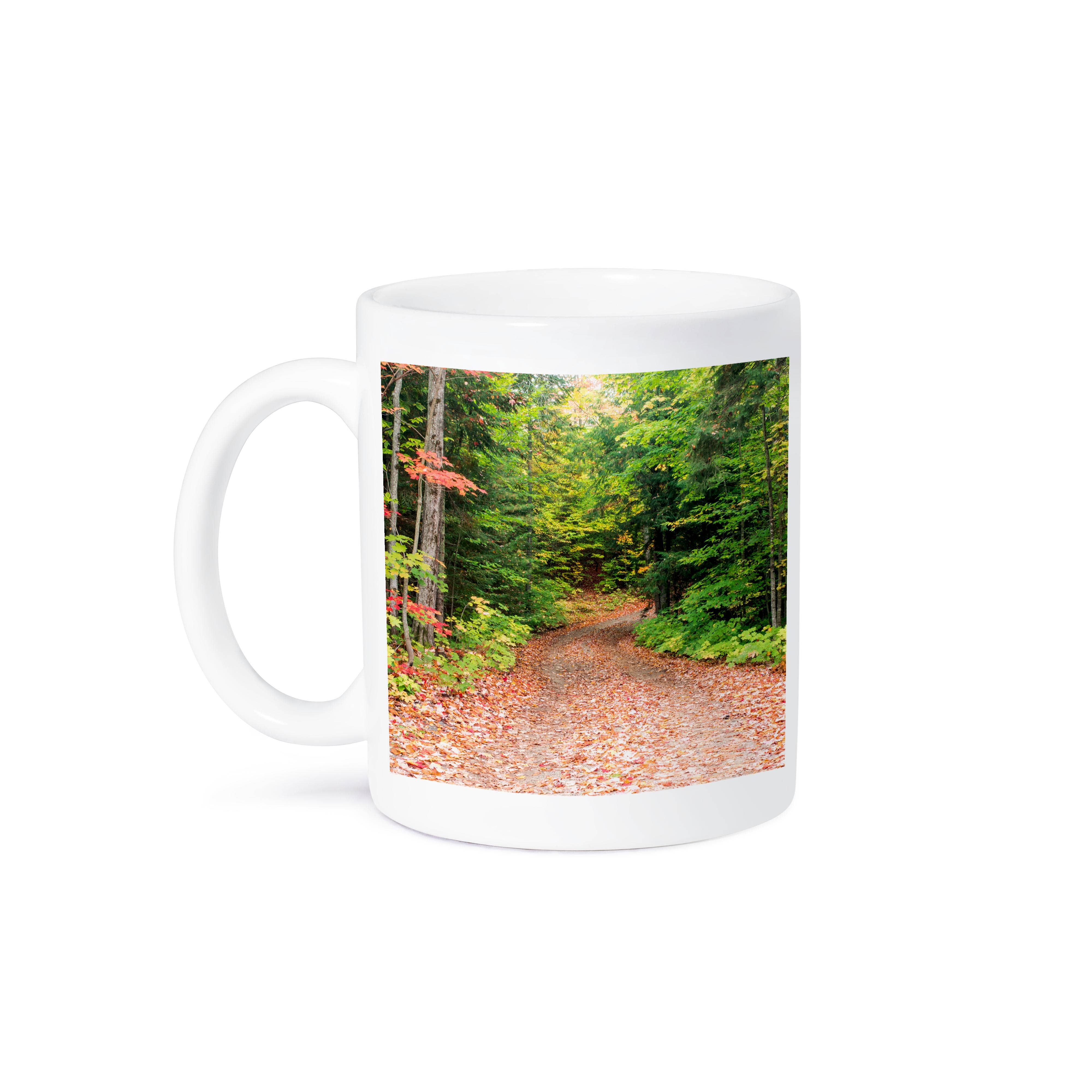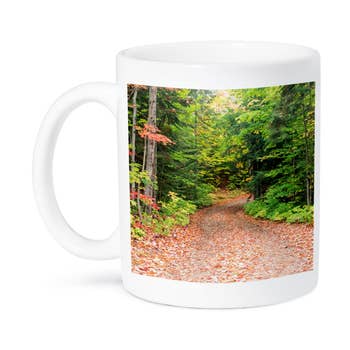 Double sided print. Top rack dishwasher safe. Microwave safe. Off white with a black rim and handle. Made of ceramic.