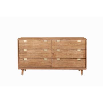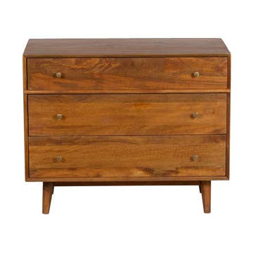 Enhance your room into a visually delightful and highly functional space with this 36-inch brown solid wood three drawer dresser. Inspired by mid-century modern design, this chest features warm walnut brown coloration that is stylishly paired with gold drawer pulls. Equipped with three easy open drawers for practical and good looking clothing storage. This dresser is built to last from high quality solid wood,. 39-inch h x 36-inch w x 21-inch d.Dressers are a great way to keep your bedroom neat and organized.Features dovetail drawer joints for long-lasting durability.Includes 3 drawers for hidden storage and organization of your essentials.Includes a felt lined top drawer to protect your delicates and valuables.Mid-century style brown dresser crafted from solid mahogany wood and veneers, featuring gold accent drawer pulls.