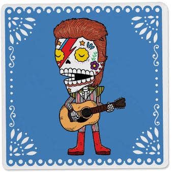 This coaster features superstar David Bowie - Aladdin Sane. Multi-functional little art pieces make great gifts, and are a great size (and price) for buyers. * Transparent sky blue glass, printed in white enamel and bronze mica * 4" square, with rubber bumpons on bottom * Dishwasher safe * Handmade in the USA Coasters are screen printed, fused glass. Glass is cut, and screen printed by hand with fine glass enamels, then fused overnight to 1415 degrees in a kiln. Each piece is made by artist Laurie Freivogel in her Oak Park studio.