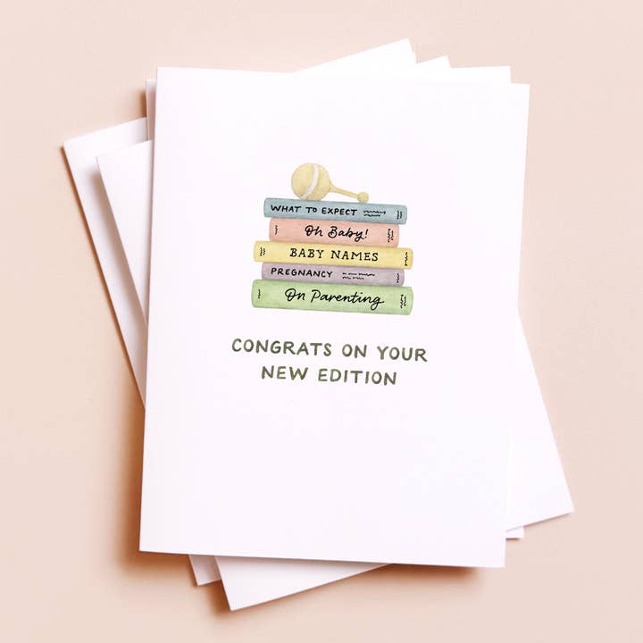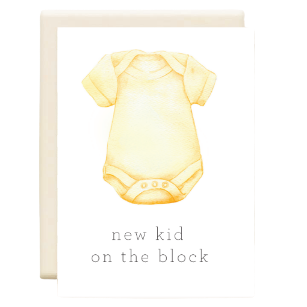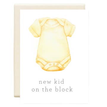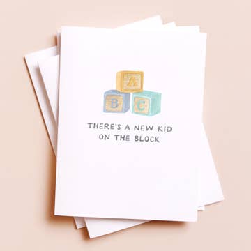 This gender neutral baby card features a cute stack of alphabet blocks, paired with a throwback pun inspired by 90s boy band, New Kid On The Block. Great for: new baby, new parents, baby showers, pregnancy, 90s kids, Millennials nostalgia Amy Zhang products are a true celebration of New England small businesses, community, and partnership. Each design features an original watercolor illustration, created by Amy in our historic Providence, Rhode Island studio. Greeting cards are printed on locally-sourced paper and packaged by our woman-owned partners in Massachusetts. DETAILS — - Single folded greeting card (blank inside) - Card measures 4.25" x 5.5" (A2 size) - Matching cream envelope included - Card and envelope are packaged in open top clear sleeve