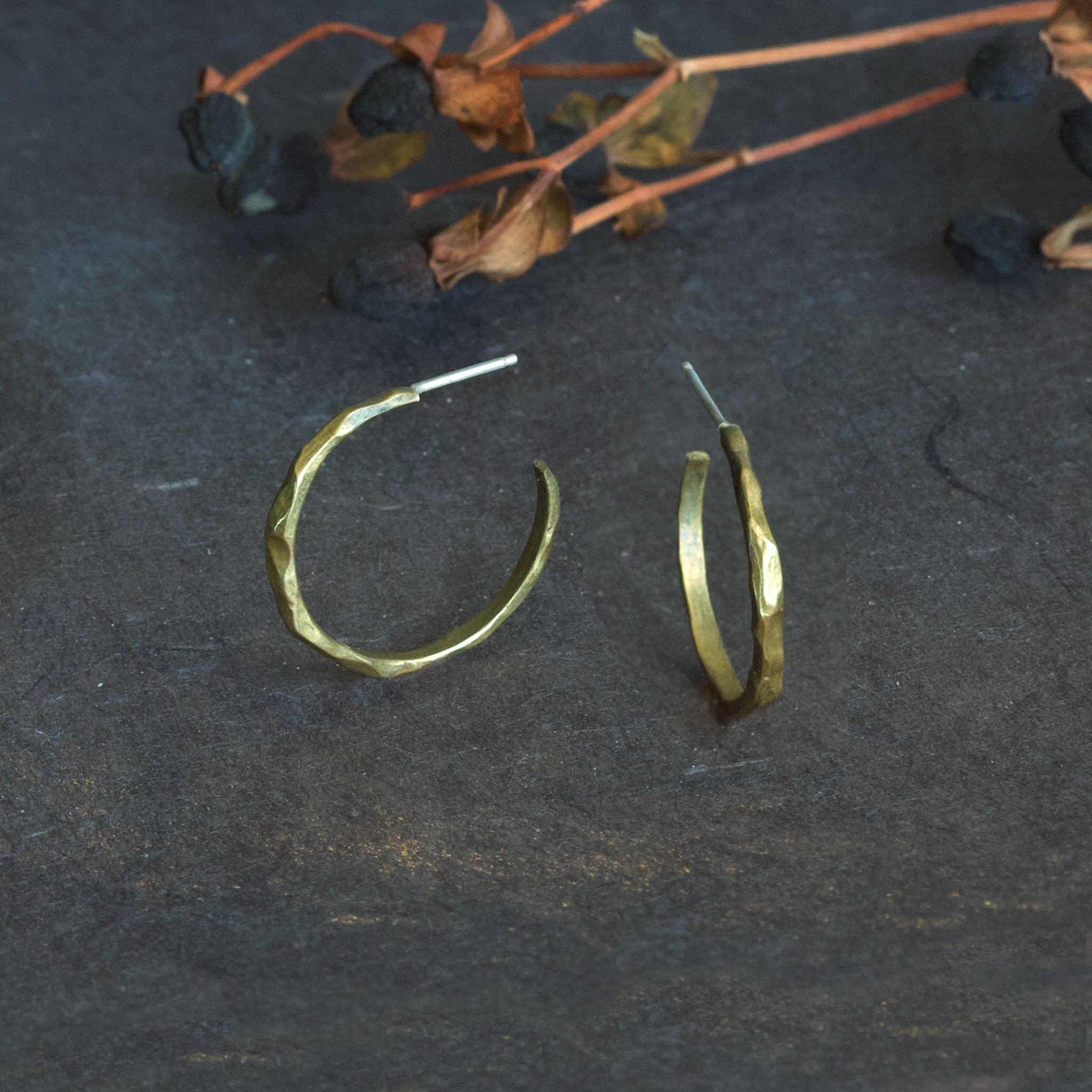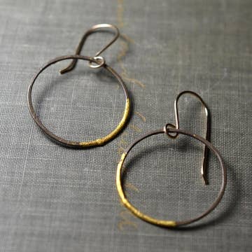 Industrial hoops with a touch of sparkle. Thin forged hoops of blackened steel with a 23k gold leaf accent. Hang from 14k gold filled earwires. Available in three sizes- Hoops measure 1 inch, and large hoops measure. Industrial hoops with a touch of sparkle. Thin forged hoops of blackened steel with a 23k gold leaf accent.