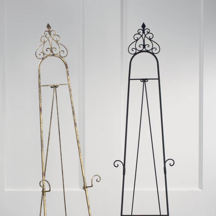 This Keller Easel will add an elegant touch to help enhance and organize any display. Made of square wire metal with adjustable brackets. Some assembly is required. Available in 3 sizes and in Black and Gold finishes. 24" Small Tabletop Easel -Can hold up to 10 lbs -2.25" bracket depth -Dimensions: 12.5" L x 10" W x 24.5" H, 2.1 lbs -Perfect easel to display small signage, posters, paintings, etc -Some assembly is required. 36" Medium Tabletop Easel -Can hold up to 25 lbs -2.25" bracket depth -Dimensions: 4.4" L x 17.4" W x 35.5" H, 2.9 lbs -Perfect easel to display whiteboards, chalkboards, posters, and paintings. -Some assembly is required. 66" Large Floor Easel (available in black only) -Can hold up to 25 lbs -4" bracket depth -Dimensions: 21.5" L × 25.3" W × 65" H, 8 lbs -Use it in the studio, as a floor painting easel, or to display art, canvas paintings, etc. -Some assembly is required.