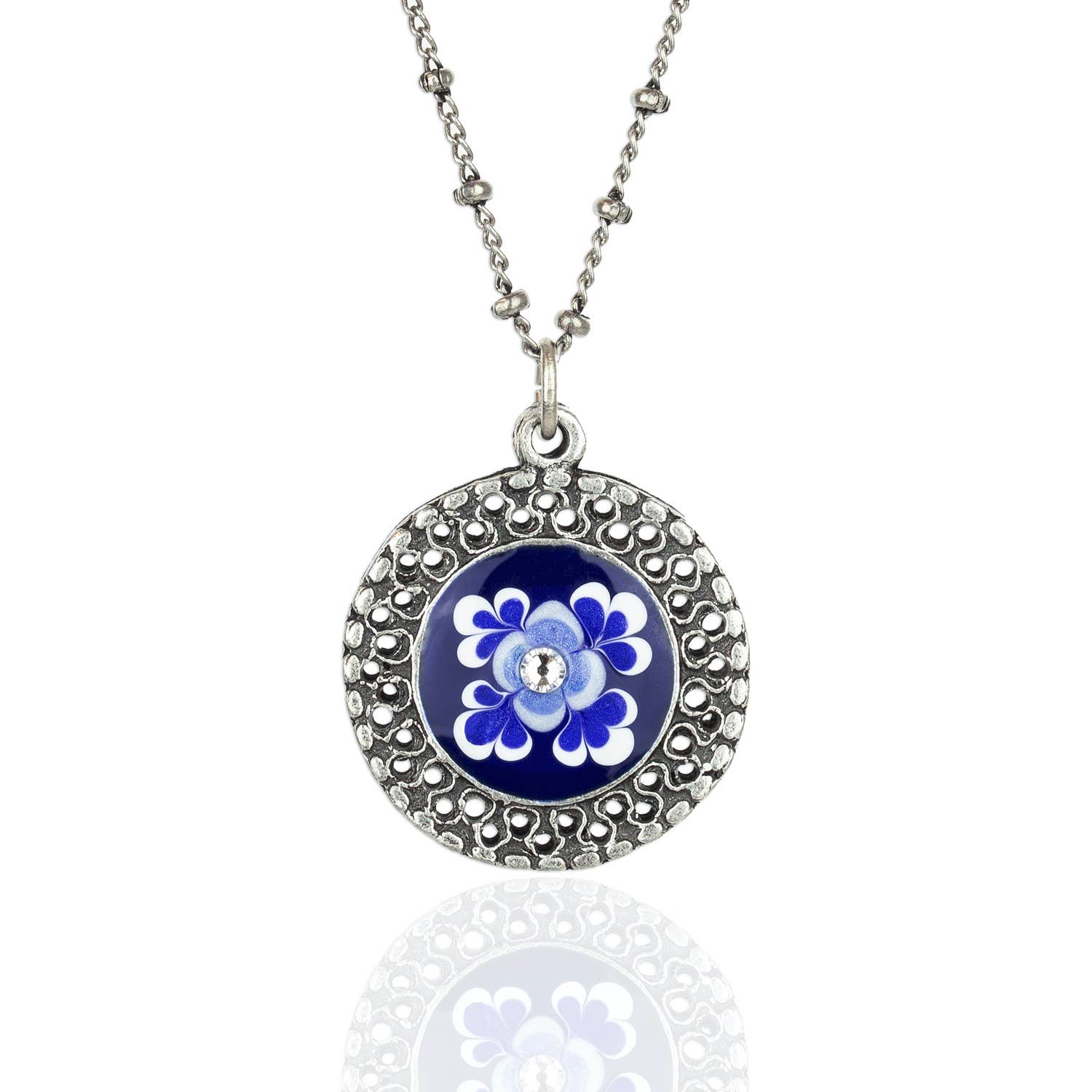 Genuine Queen Anne's Lace flower on "Belize Breeze" gorgeous turquoise color set in pewter cast settings with shiny sterling silver plating. Setting measures 1.5" x 1.25. All models for castings were made in house by our master model maker and are cast and plated in Rhode Island. Sterling silver plated chain measure 16" plus a 2" extension.