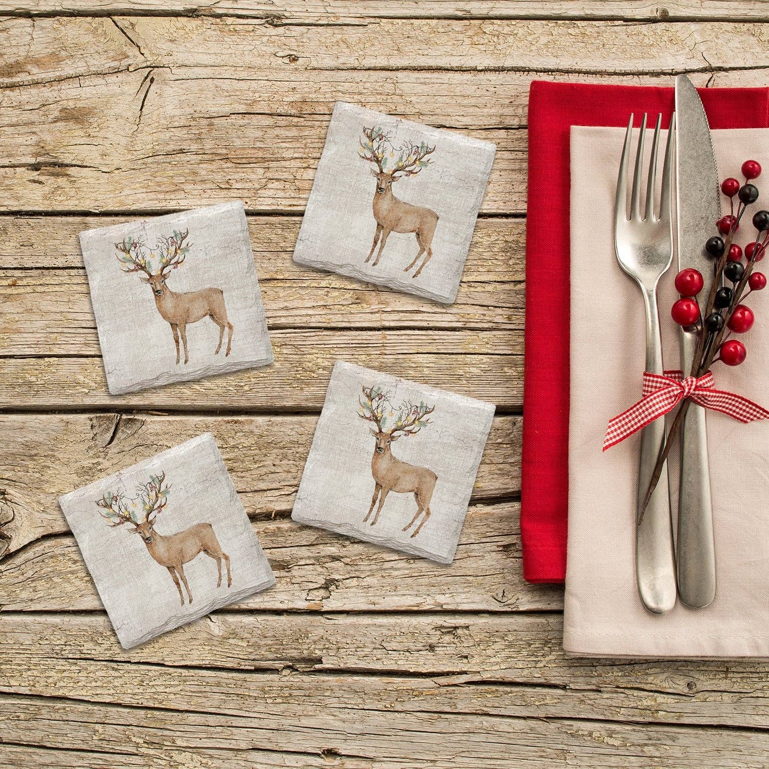 Christmas Farm Animals Resin Coasters sell as a set of four durable resin coasters with a Christmas, farm animal-themed design. Coasters feature the image of a pig, cow, sheep, or donkey with festive, holiday accessories. Measures 4" square by .25" thick. Set/4.