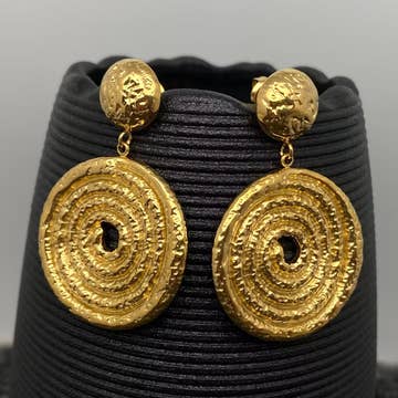 These elegant earrings will draw attention with their detailed medallion coin center framed with a twisted rope chain. These circular motifs swing from the lightly hammered coin by jump rings which add extra swing and movement to the design. Product details Materials: Pewter metal plated with 24 kt gold/sterling silver/rose gold. Measurements: 1.5" long. Earring Closure: Post back. Light weight: 0.11 oz.
