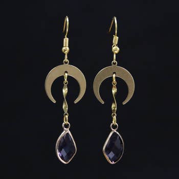 This is a very cool earring with a hammered brass moon,semi precious beads & gold crystals. To all the fabulous Moon Goddesses out there!! The Moon represents powerful feminine energy, mystery & power. Choose Stones: Amethyst promotes balance & healing. Turquoise represents wisdom, tranquility, protection & hope. It is considered sacred by Native Americans as a master healer. Metal: Brass Size: Approx 1.5 Handmade with Art & Soul