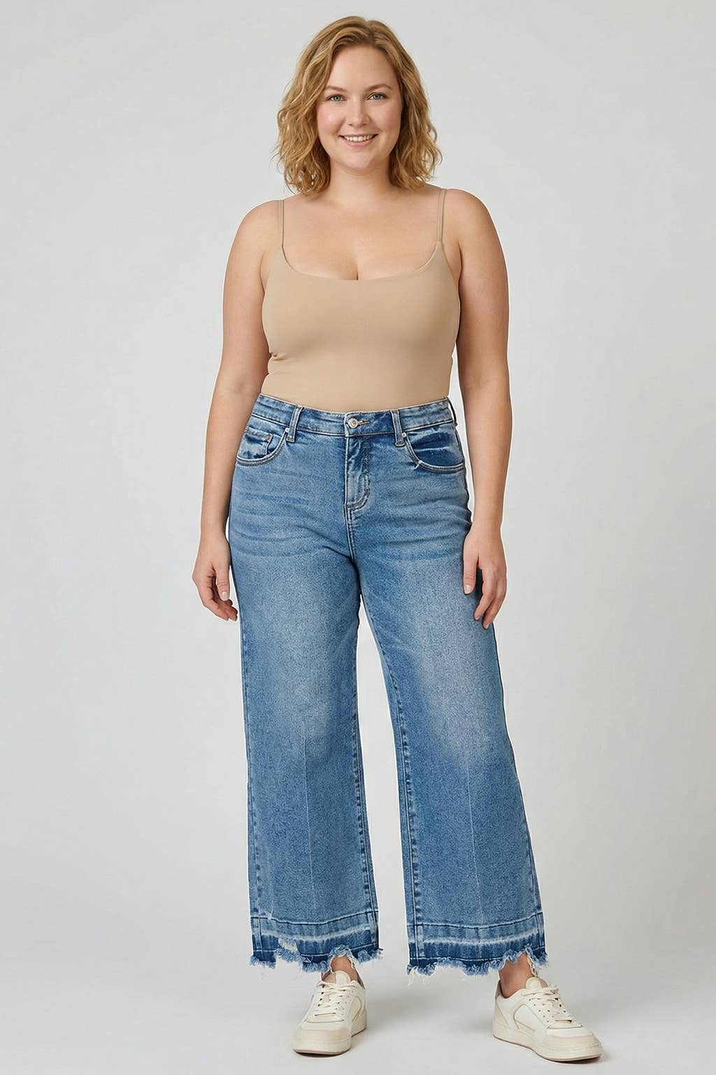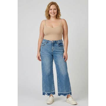 OPEN PACK ULTRA HIGH RISE 90’S WIDE LEG FLARE JEANS MEDIUM WASH RIGID DISTRESSED HIDDEN BUTTON FLY REGULAR HEM WIDE LEG DENIM JEAN PANTS RISE 11 1/2” INSEAM 34“ IN 5/26 Model in size 3/25 100% COTTON 11.4 OZ