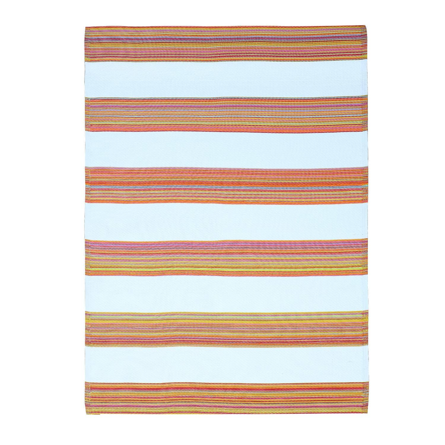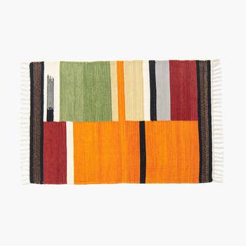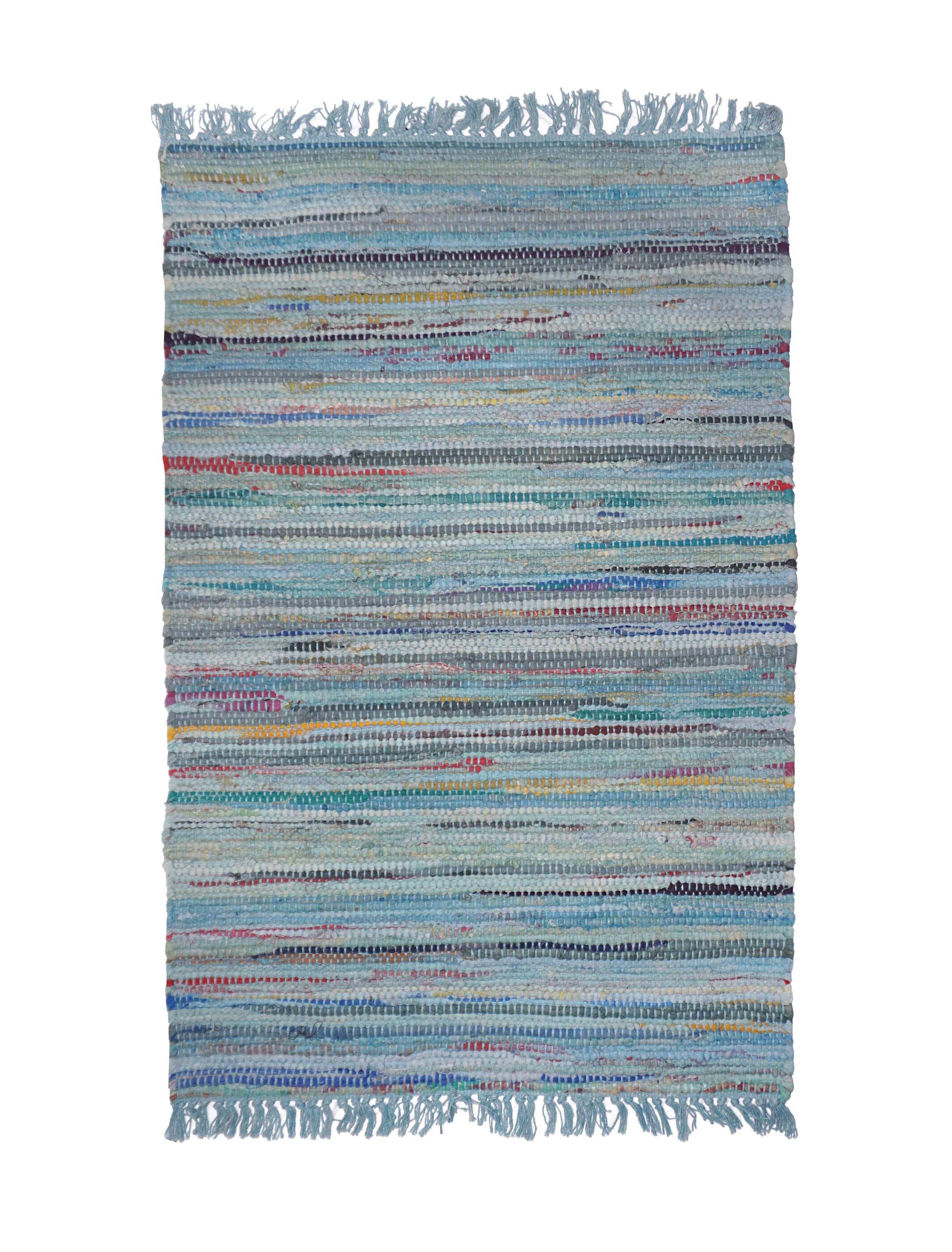 A stylish rug from our Primitive Collection displaying a colorful chindi inspired stripe design made by weaving various fabrics into the construction of the product to create a unique combination of colors and textures while repurposing leftover fabric. Rug design features cream cotton with various Chindi stripes in the center. Chindi rug can be used indoor or outdoor and features skid-resistant backing to help stay in place. Spot cleaning recommended. Our Chindi Stripe rug is packaged neatly rolled with hangtag. A stylish everyday home accent perfect for adding a pop of color to any room.