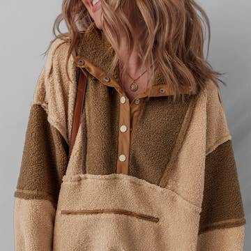 Oversized fleece pullover with a high neck, half-zip front, contrast seam detailing, front pouch pockets, and an adjustable drawstring hem for a relaxed fit. Self: 100% Polyester Contrast: 100% Polyester Model is 5'8" tall and wearing size Small