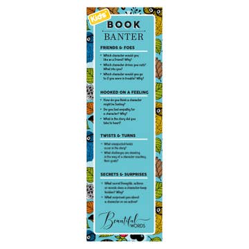 Imaginations are sparked, empathy is nurtured, and critical thinking is stimulated when kids read and talk about books. The Kids’ Book Banter bookmark helps to foster engaging conversations between adult and child, providing a peek into a child’s thinking about the books they read. These handy conversation guides are also a great way to get kids talking about books together, whether it is with parents, in a classroom or in a kids’ book club. Suggested for ages 4-12, the Kids' Book Banter bookmark comes in four fun prints. Spark kids' love of reading by having kids banter about books! Genre: picture, chapter, & middle grade books This Canadian-made bookmark is printed on sturdy 16 pt cardstock with an overall gloss UV finish and comes encased in a protective, clear plastic sleeve. For every Beautiful Words’ bookmark sold, 10% of the proceeds go to the WindsorEssex Community Foundation to support reading and literacy programs for vulnerable populations.