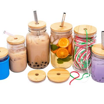 Bamboo lids fit 16 ounce and 20 ounce iced coffee glasses Includes set of 4.