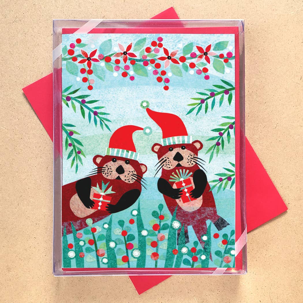 Wishing you holiday greetings from Olive the Otter Reindeer's Christmas Tree Farm! Printed on 110 lb watercolor texture paper. A2 Size: 4.25" x 5.5". Blank inside. White envelope included. Cards come in clear plastic sleeve or clear card box for set of 6 Original watercolor holiday otter illustration.