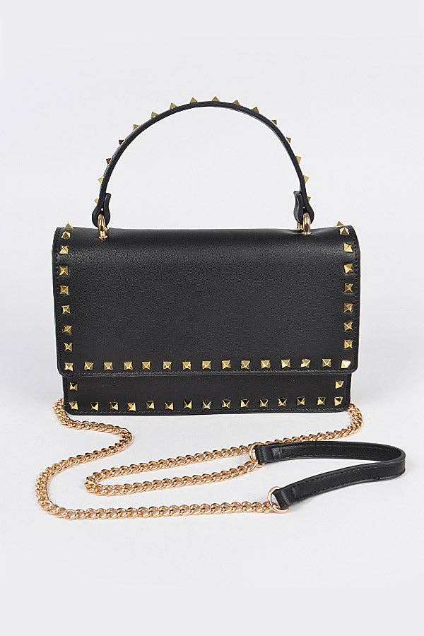 Black DASTI Women's Bag decorated with massive studs on the front surface is a hit of the brand new Summer Collection 2022. The bright fancy design of the Studded Handbag for Women with big riveters on the face is easy to mix with all outfits. The specious Medium size trendy studded purses with an extra unordinary look add some rock vibes and chic to your style. Dimensions: 9" x 7.5" x 4". Straps:Â The bag with Spikes comes with two straps and two acrylic chains: - long strap up to 45 inches; - short handle 12 inches; - 2 plastic chains to make the short handle longer and give the bag a chic look. The high-quality opening hardware with gold plated craft shiny tone allows you to change the straps on bags and carry this bag: * as a crossbody bag; * as a top shoulder handbag; * as a tote bag; * as a handle side purse; * as a handbag.