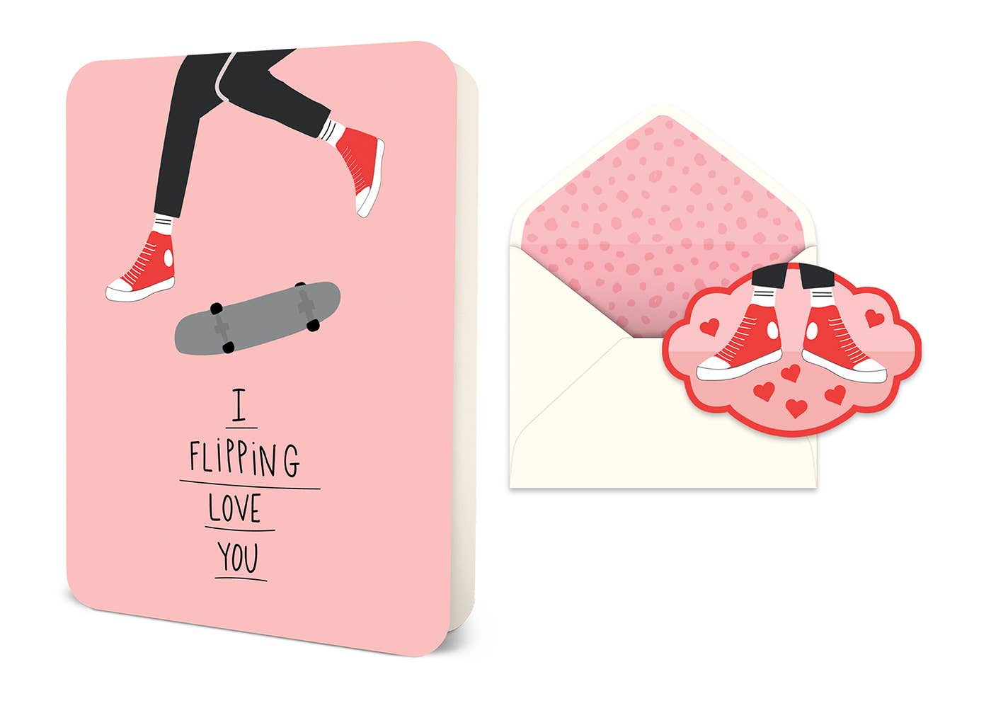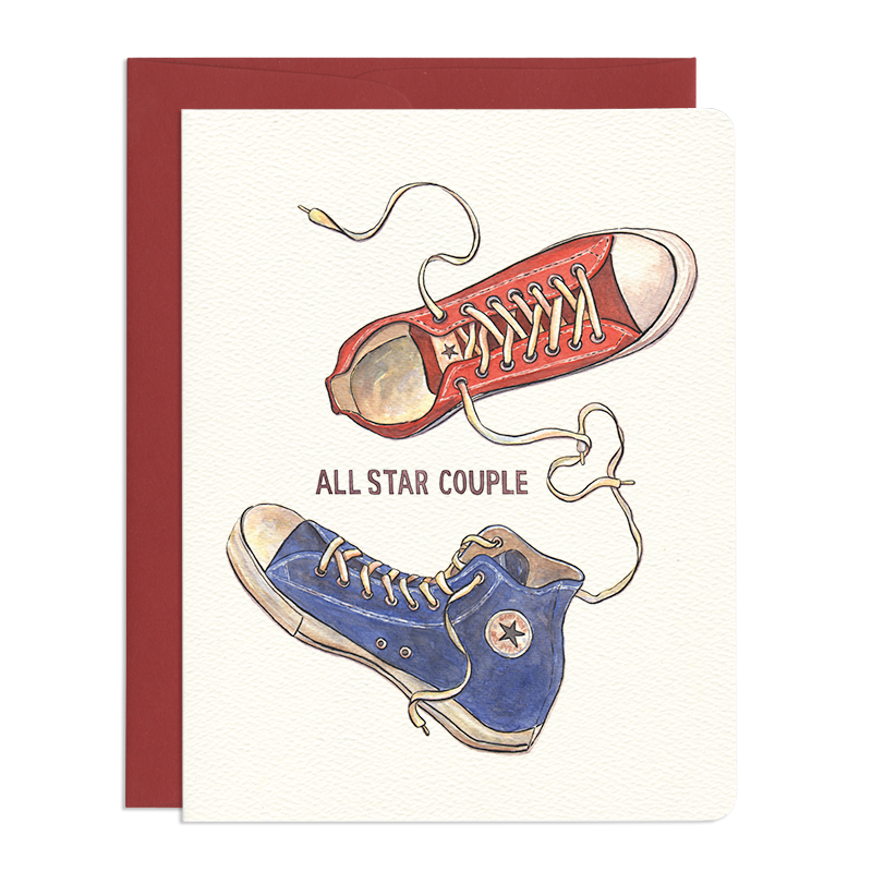 Congratulate your favourite down-to-earth couple with this sweet and unconventional card, featuring a pair of classic sneakers happily joined in the simple language of love. - A2 size (4-1/4"x 5-1/2" when folded) - Blank inside - Offset printed in Toronto on natural-white, heavyweight, textured paper - Die-cut with rounded corners - Matching envelope included SKU: 1479