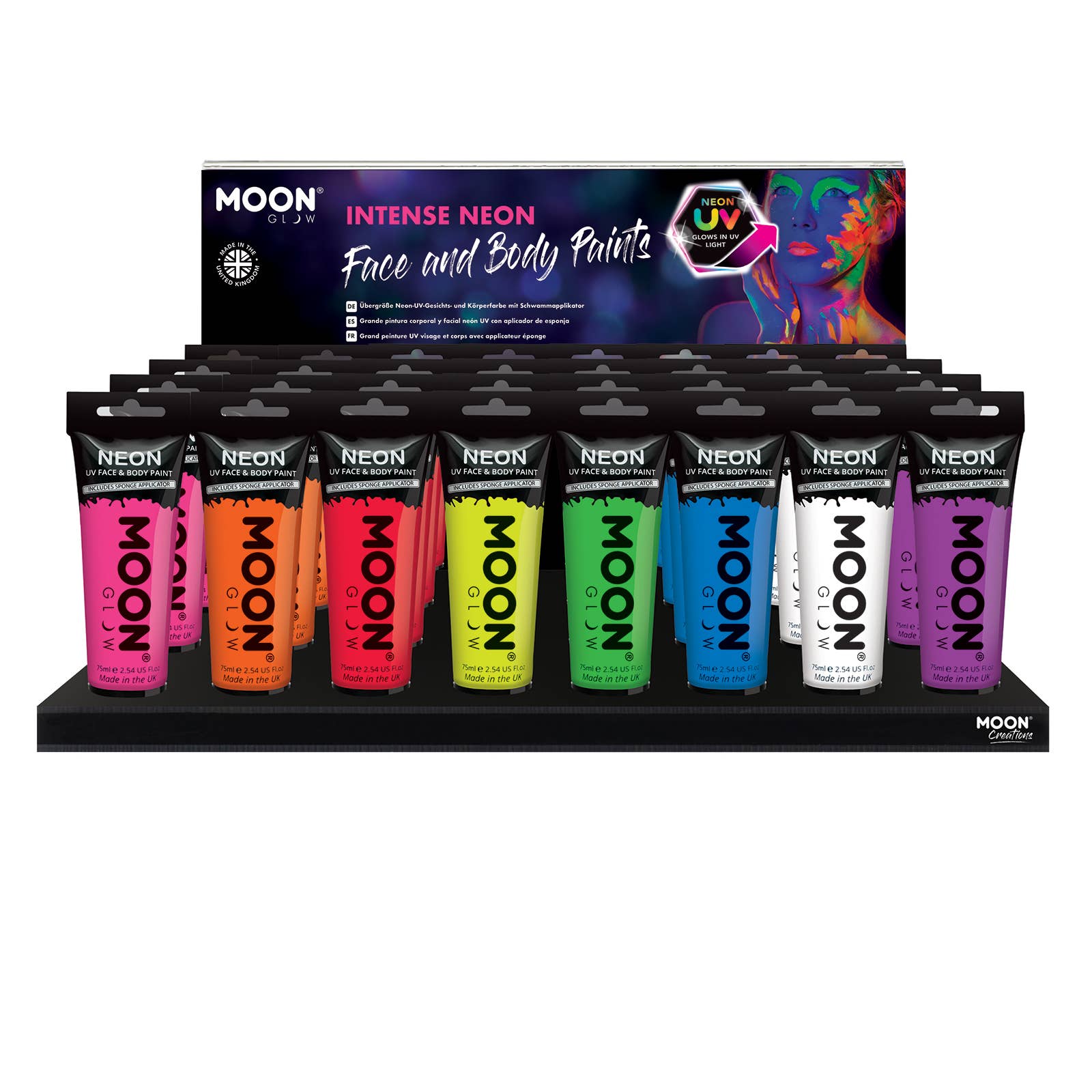 Includes 48 pieces of product and a custom acrylic display. Create stunning effects on the face and body using our range of 8 vibrant colours of Moon Glow Neon UV Face & Body Paint! Bright neon coloured paints in daylight that come alive under UV lighting / Blacklights, producing a spectacular UV Glow. Ready to use, water based face paints in a tube format, our flake free and smudge resistant formula ensures your designs will last all night. After use, simply remove with soap and water. ire Moon Creations collection is free from Fragrances, Parabens and SLS.