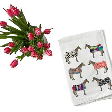 Celebrate Derby or any equestrian celebration with this fun champagne tower inspired design. 30" x 30" 100% cotton dishtowel. Machine wash cold, low tumble or line dry.