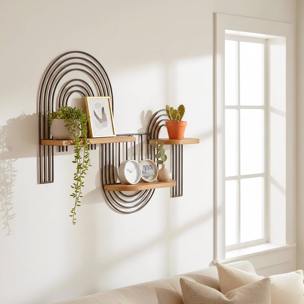 The Arched Wood Wall Shelf brings sculptural style and smart function to any room. Crafted from solid wood, this shelf features a fluted back panel, rounded edges, and a smooth arch—hallmarks of mid-century modern design. Its rich, warm finish adds a grounded elegance, while the carved grooves create depth and texture. In addition, two curved shelves provide space for styling everyday essentials or your favorite decorative pieces. Whether you hang it in an entryway, a cozy kitchen nook, or above your bedside table, this shelf makes a strong yet timeless statement. For example, display candles, framed photos, or small plants for a curated look. Because the design blends retro inspiration with modern minimalism, it fits beautifully into homes with vintage, transitional, or contemporary decor. • Two Curved Display Shelves • Dimensions: 21.75″ H x 11.5″ W x 5.5″ D (overall) • Each shelf: 11.5″ L x 4.75″ D • Heavy-duty quality with Included Hanging Hardware 1MM4034