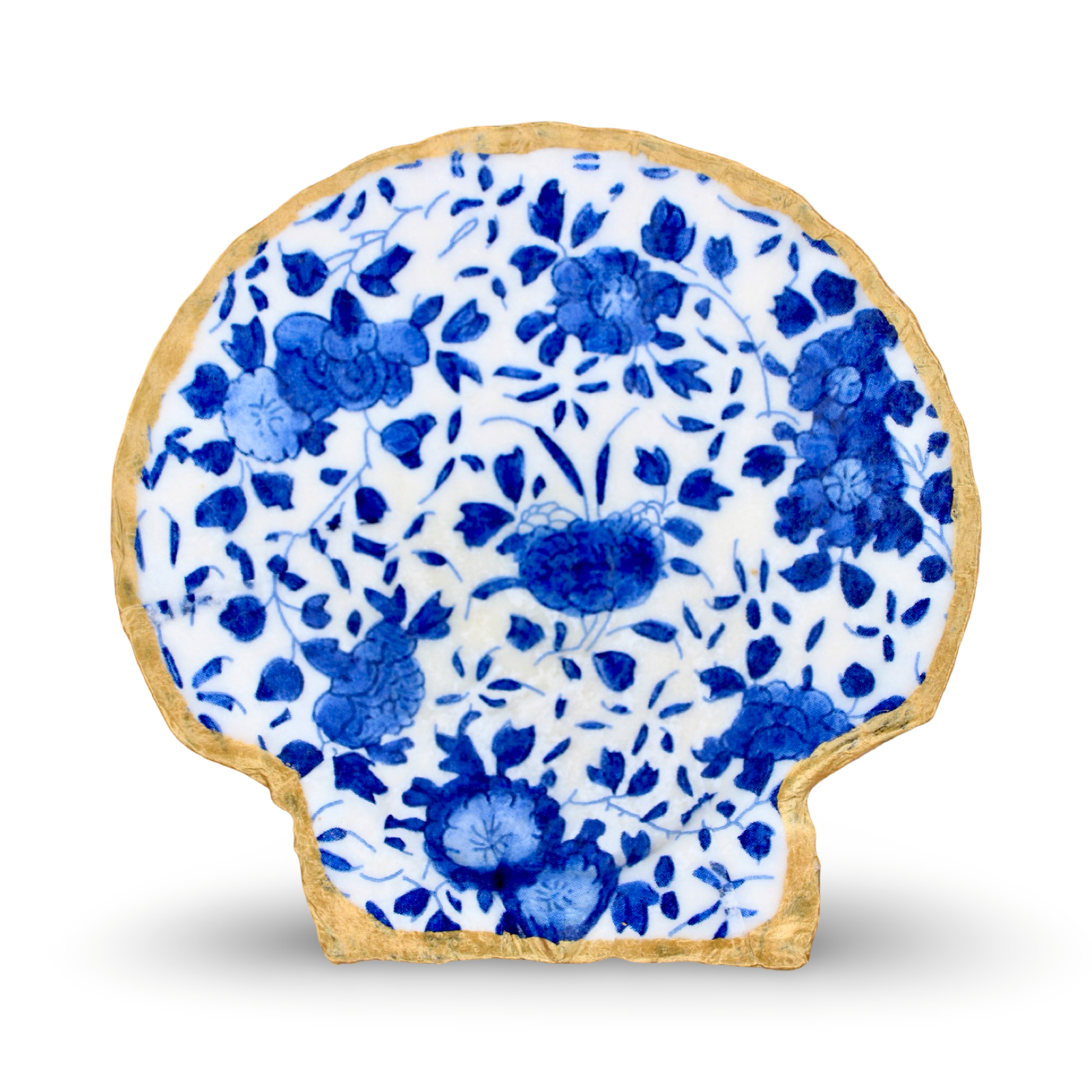 Each of these one-of-a-kind jewelry dishes begins as a natural sea shell, carefully selected for its organic shape and beauty. Measuring approximately 4–5 inches, no two are ever exactly alike. The interior is artfully decoupaged with custom designs and finished with hand-painted gold edges, adding a touch of coastal luxury. Perfect for holding rings, earrings, or small keepsakes, these unique pieces also shine as decorative accents on a vanity, nightstand, or bookshelf. For indoor use only in dry areas to preserve their handcrafted finish. Ships in a sheer organza bag with a keepsake card explaining all the ways it can be used (catch-all, jewelry dish, décor, etc.). A beautiful blend of nature and artistry—each shell is a little treasure of its own.