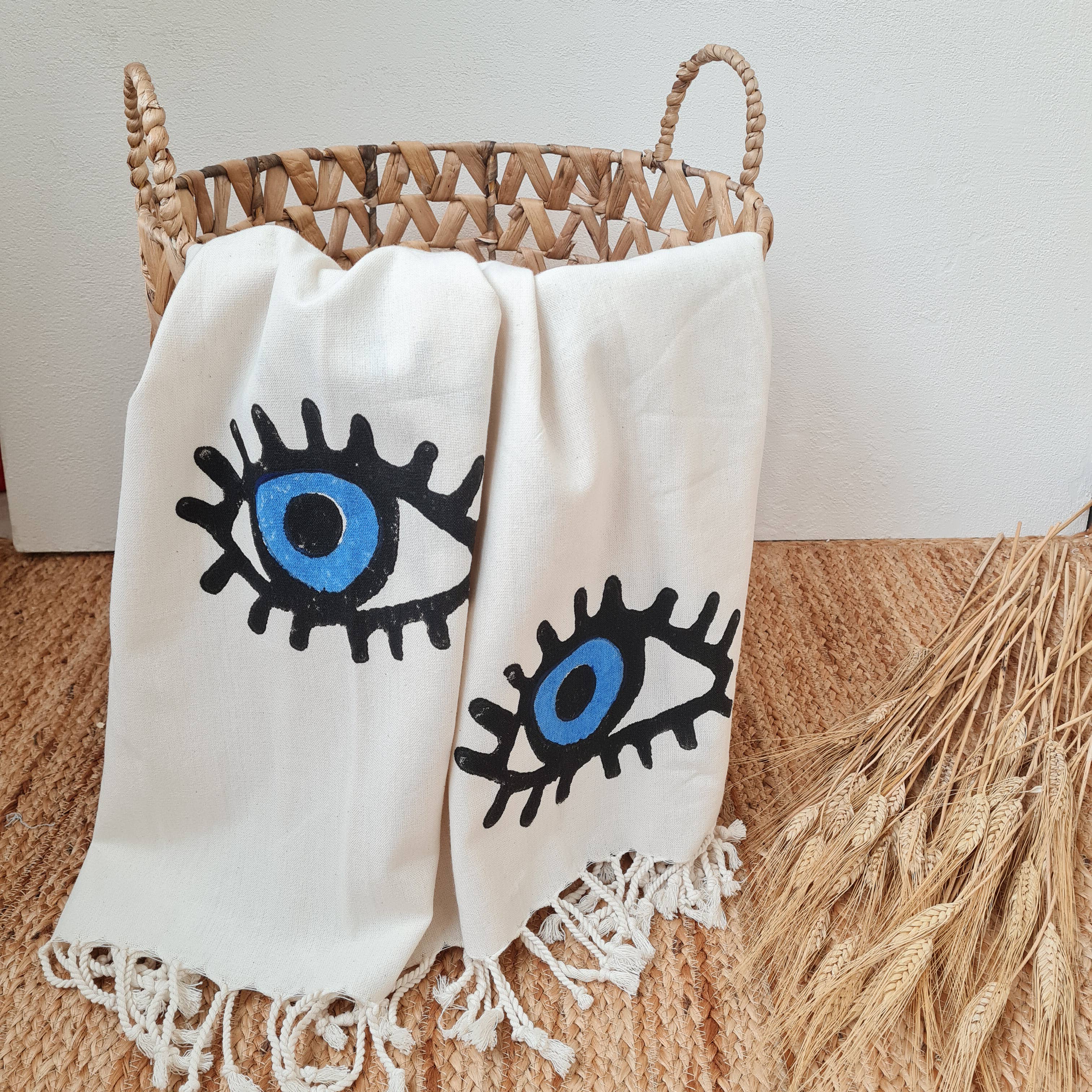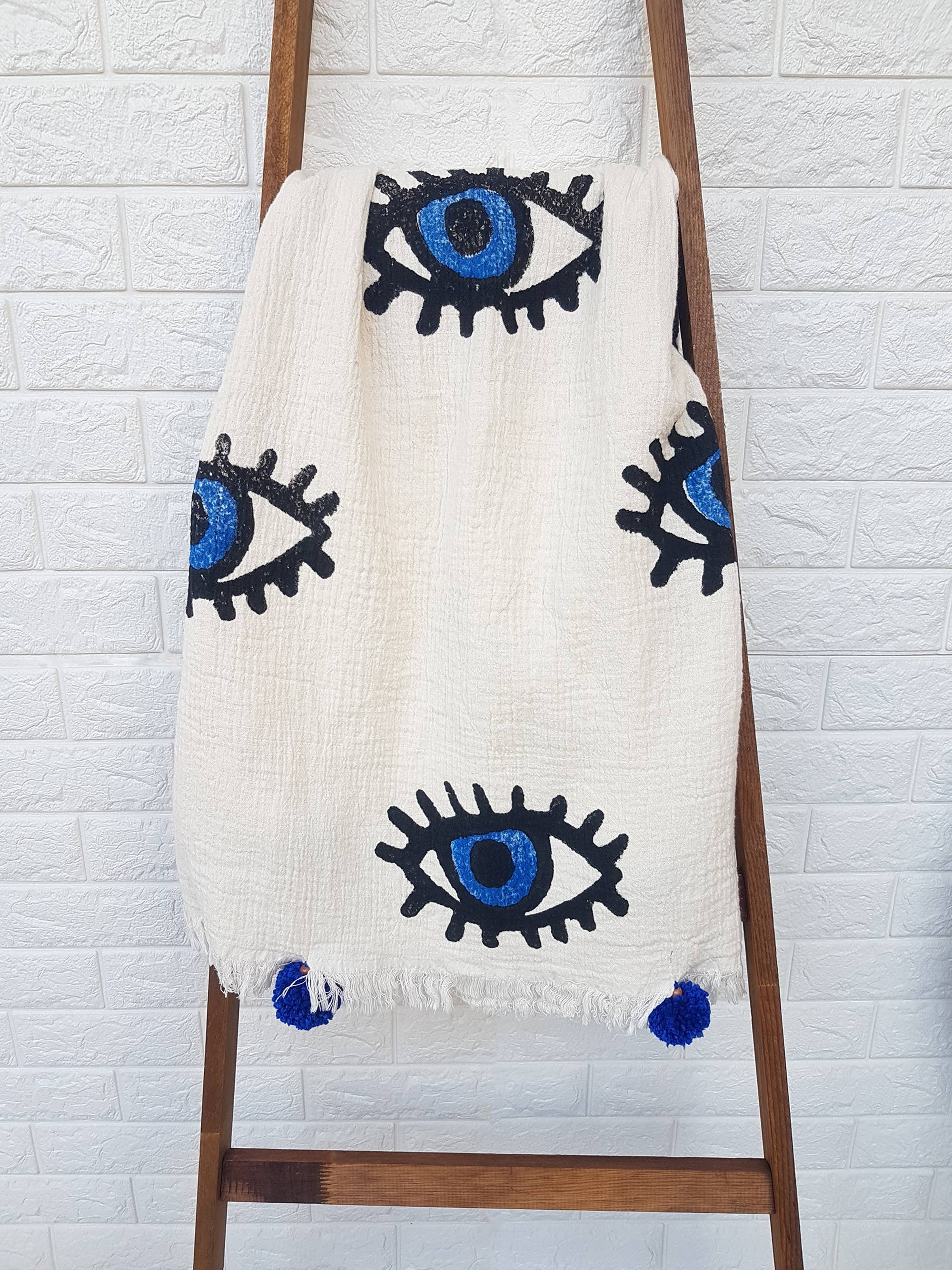Bring some boho vibes to your home with the Evil Eye throw blanket. Made with 100% soft Turkish cotton, this throw boasts a soft, cashmere-like texture, and the celestial-inspired design features an Evil Eye pattern. The handmade fluffy pompoms add a touch of whimsy and coziness, making this throw a must-have for anyone looking to bring a celestial and bohemian vibe to their home decor. The hand-printed Evil Eye pattern adds a touch of mysticism to your space. Plus, the handwoven construction means you can feel good about supporting locally skilled artisans. Whether you're lounging in the living room or enjoying a picnic, this throw blanket is versatile enough to use in any setting. Size - 35.5x79 inches / 90x200cm Washing Instructions - Machine wash cold at a gentle cycle. - No bleach. - Iron on the reverse side Please do not hesitate to reach us with any questions. Thanks for visiting